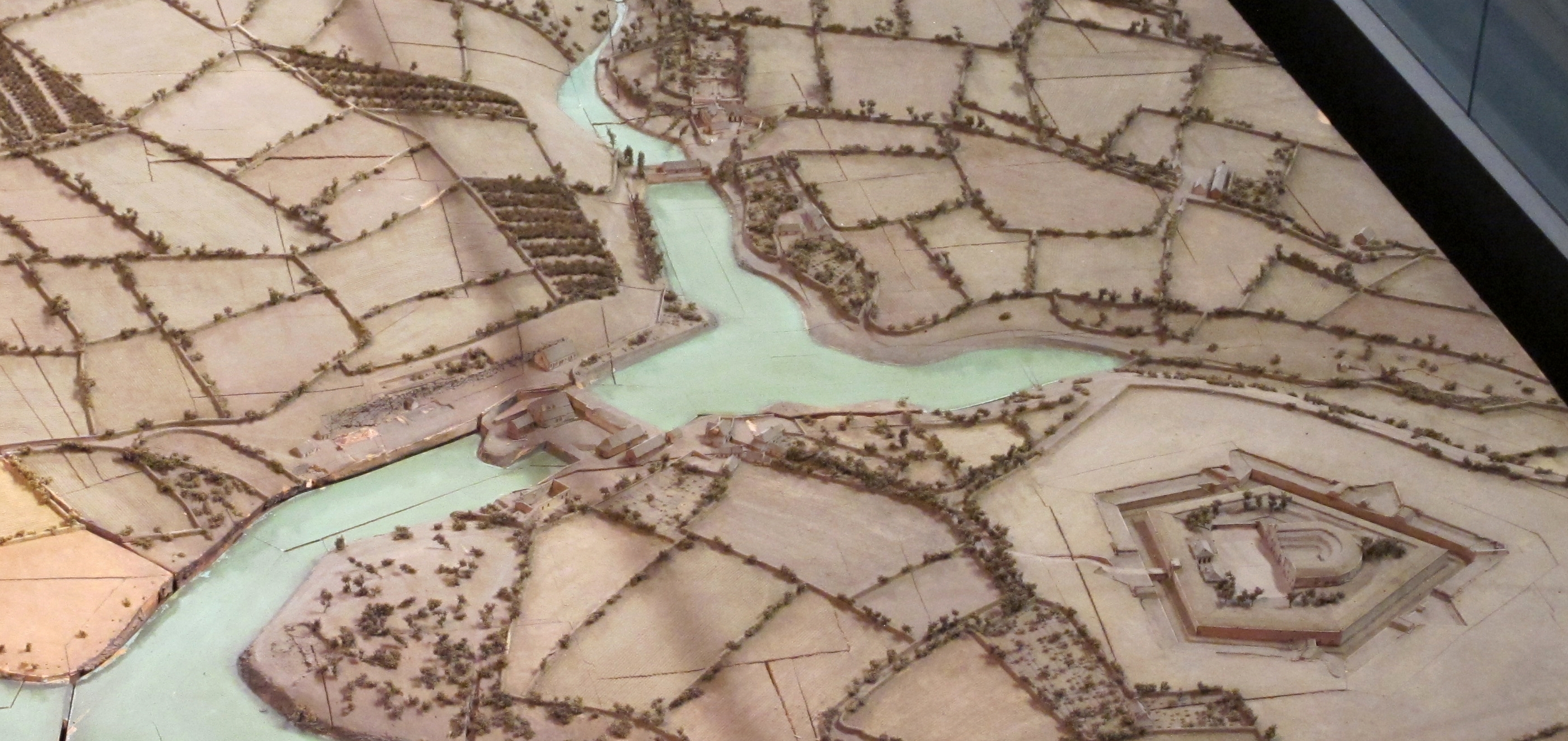 Vue de situation des forges de la Villeneuve depuis le nord-est sur le plan-relief de Brest (1807-1811). Les forges sont implantées sur la Penfeld à proximité immédiate du Fort de PenfeldImmatriculation