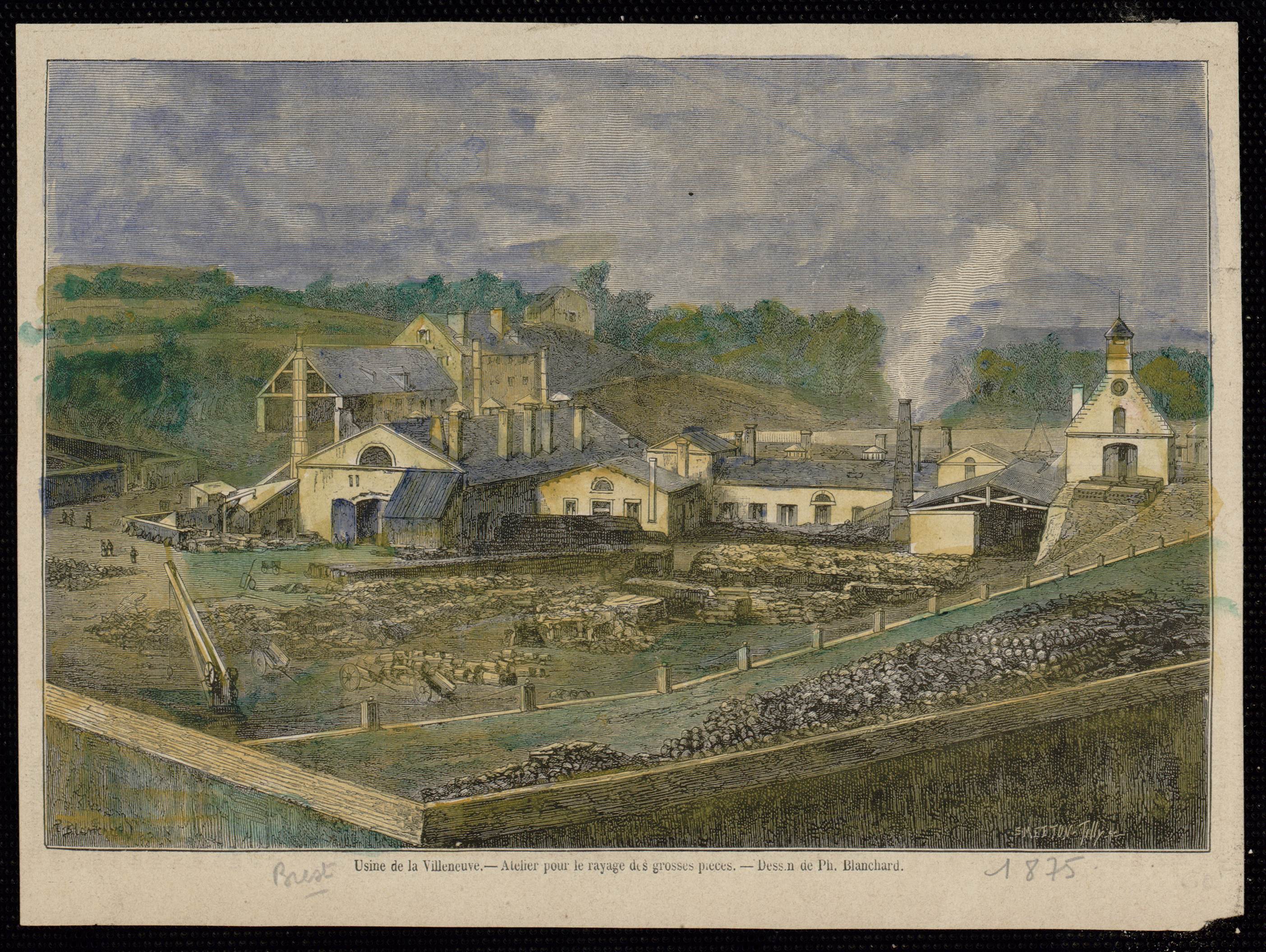 Vue de l'usine de la Villeneuve depuis l'est, vers 1875, gravure d'Auguste Tilly pour l'atelier de gravure Smeeton d'après un dessin de Pharamond Blanchard. La légende précise : "Usine de la Villeneuve. - Atelier pour le rayage des grosses pièces. - Dessin de Ph. Blanchard"