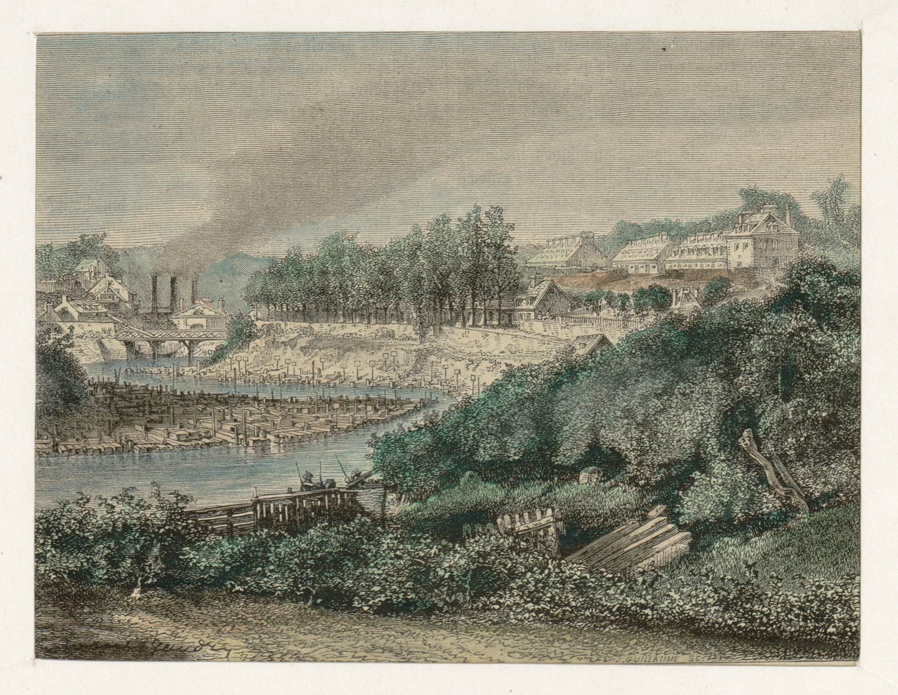 Vue représentant la Penfeld et le parc à bois de la marine, gravure d'après un dessin d'Auguste Gaudry (Archives municipales de Brest : 4Fi00028). En arrière-plan, les forges de la VilleneuveImmatriculation