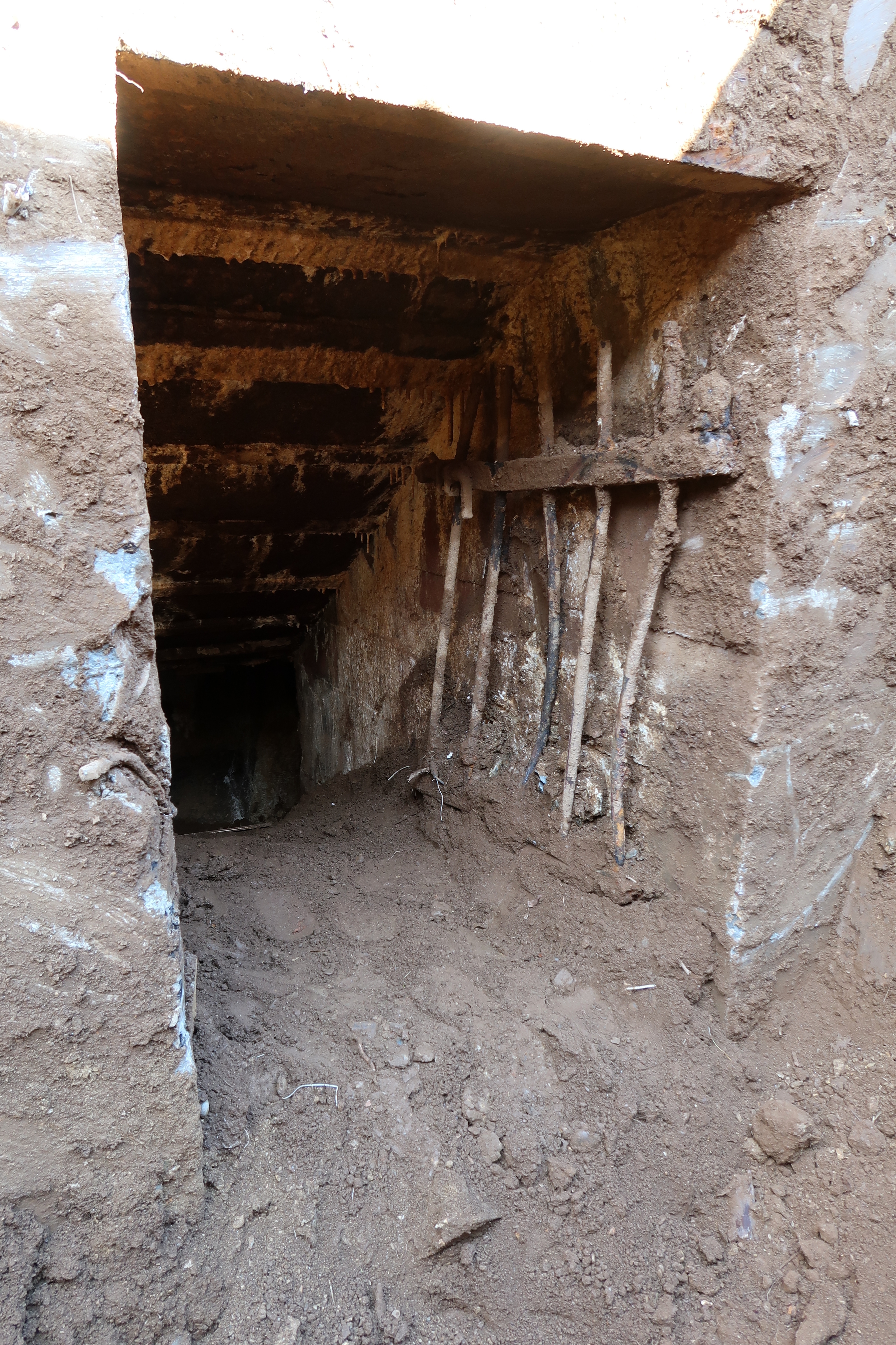 Vue de l'entrée orientée vers le sud : la grille de défense est en place. La hauteur de remblai dans l'escalier avoisine un mètre d'épaisseurImmatriculation