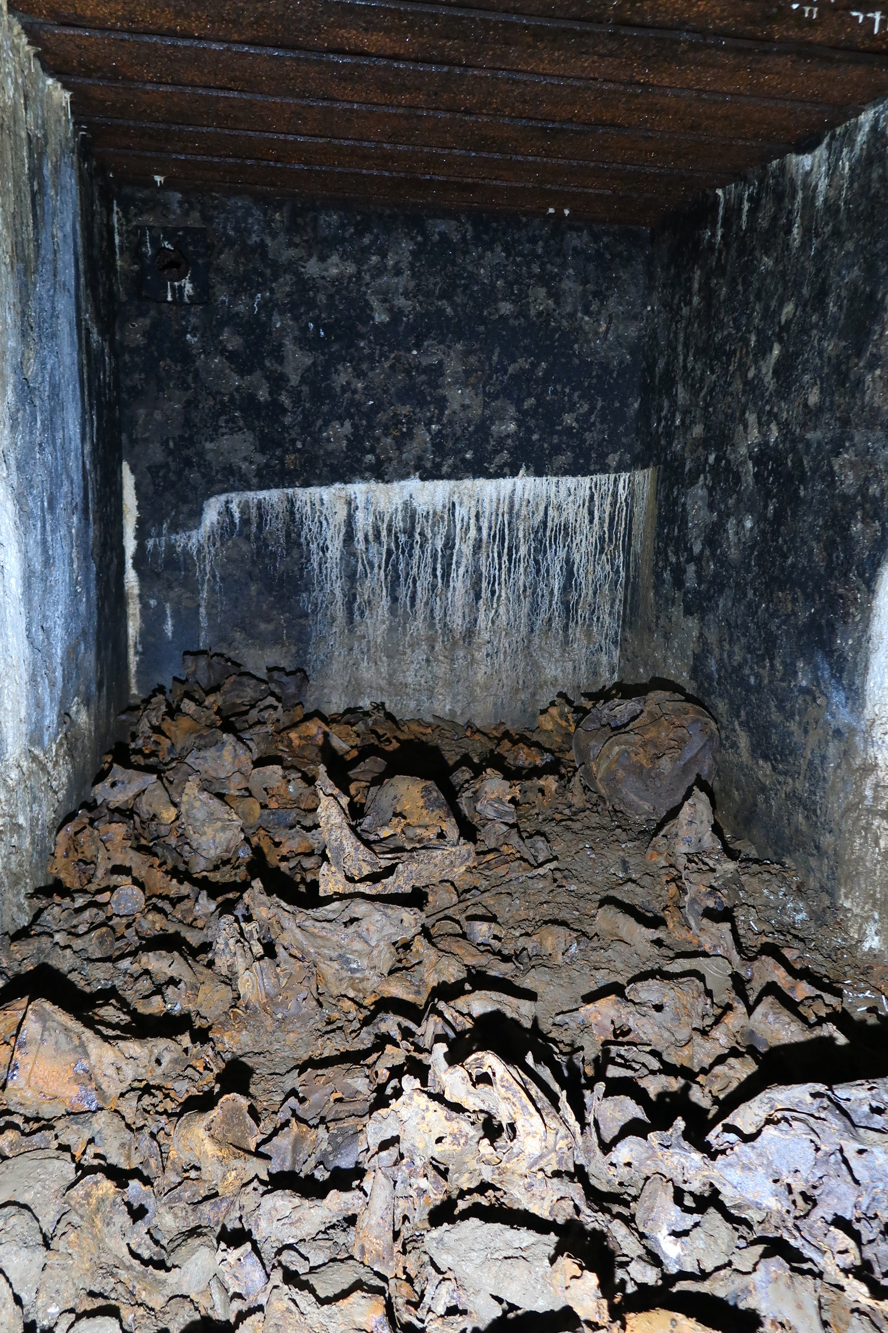 Vue de la soute à munitions (à droite) : débris métalliques de caisses d'obus et obus brisésImmatriculation