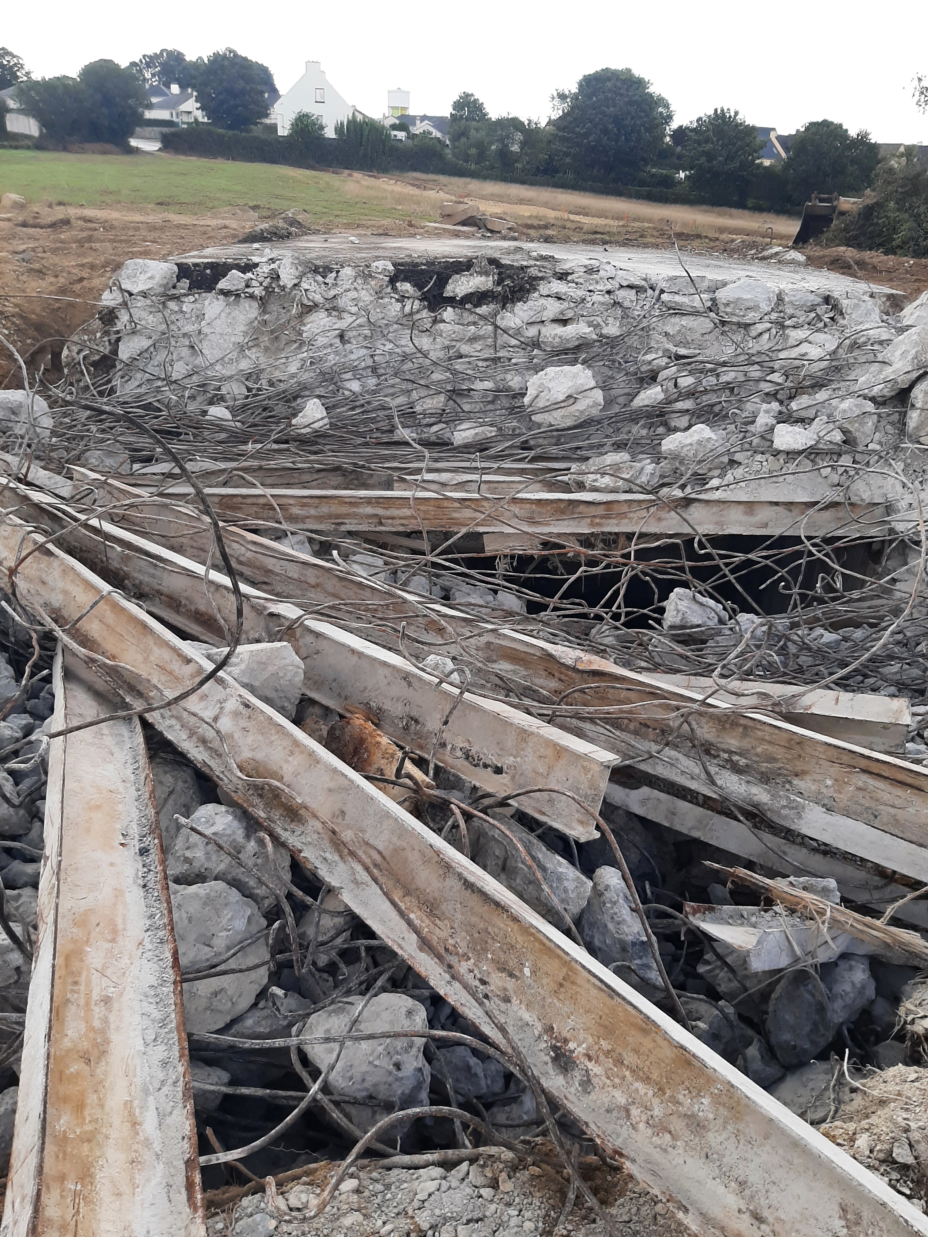 Vue de la déconstruction : dalle de couverture et murs périphériques en béton armé (25 septembre 2022). Dans le béton : fers et poutrelles en acier en IImmatriculation