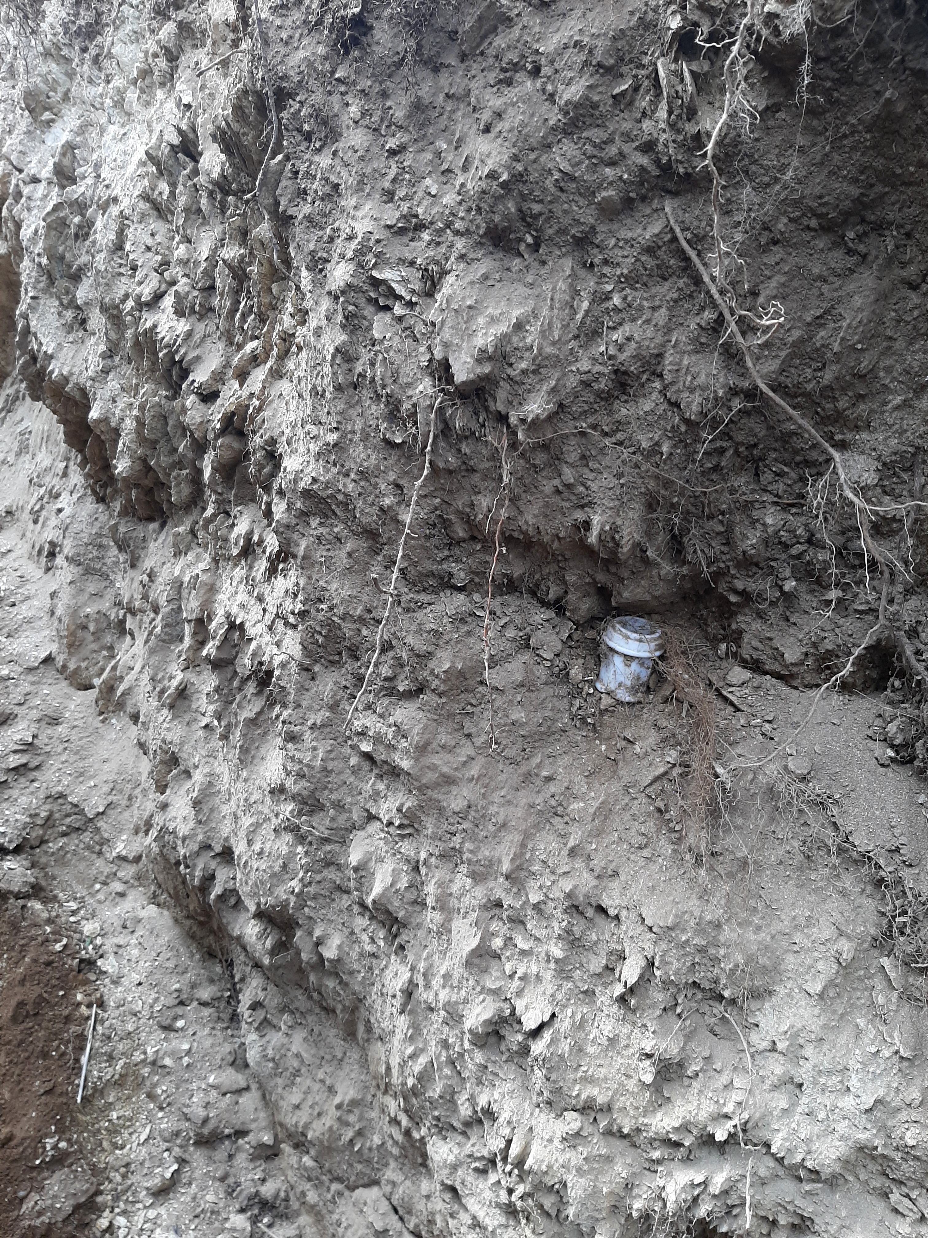 Vue de la déconstruction : couche de sédiment (25 septembre 2022). Objet en porcelaine identifié comme une boîte à onguentImmatriculation