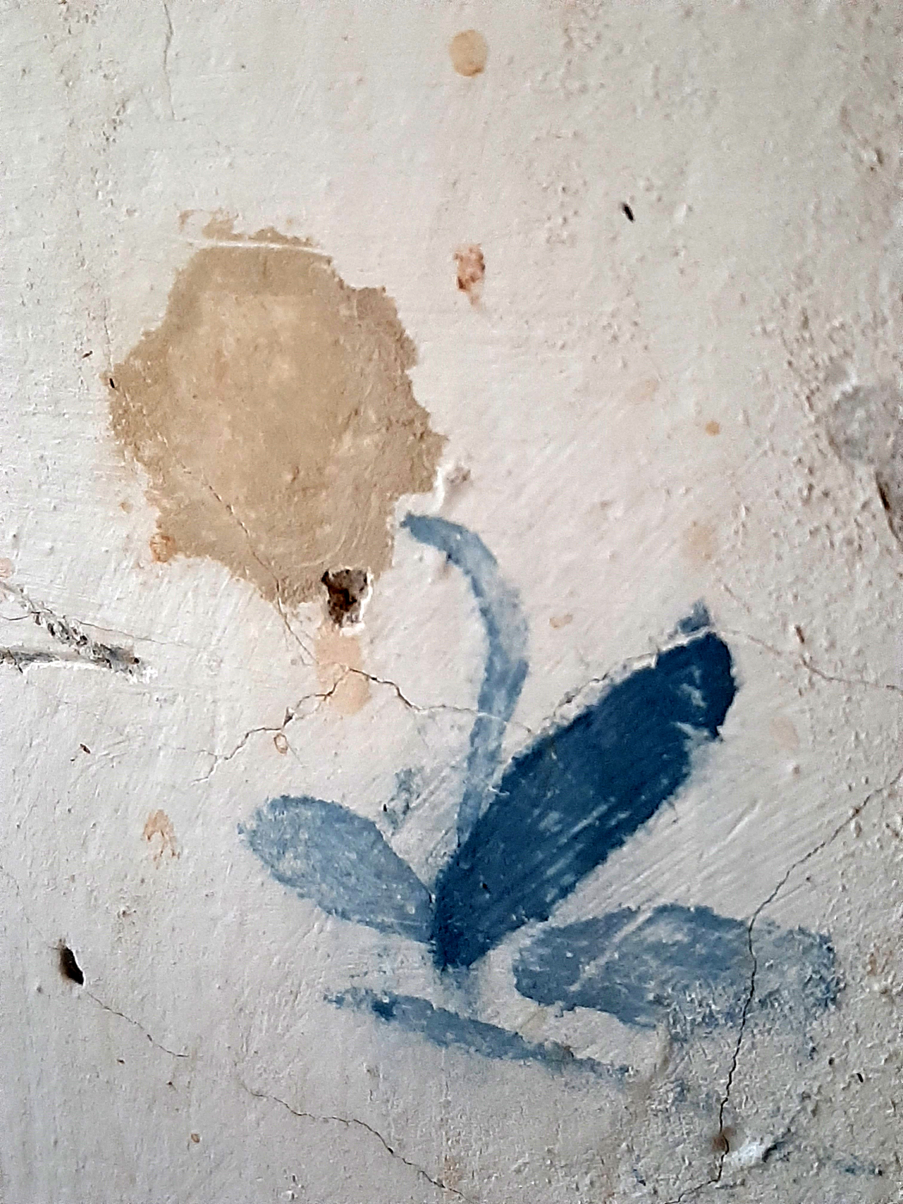 Vue de la déconstruction : pièce de vie - chambre de troupe, peinture murale imitant une tapisserie constituée de fleurs (25 septembre 2022)Immatriculation