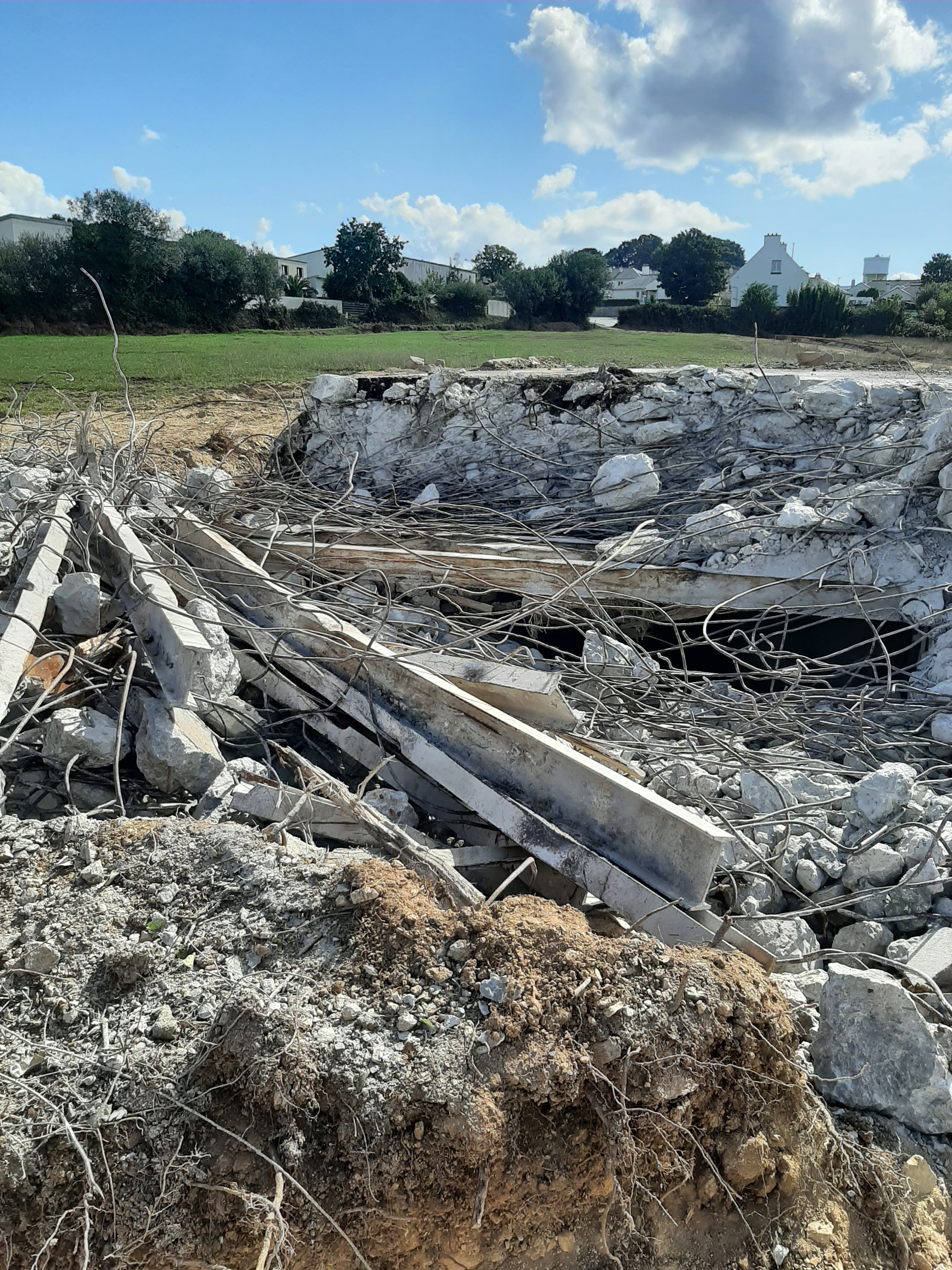 Vue de la déconstruction : dalle de couverture et murs périphériques en béton armé (25 septembre 2022). Le plafond est constitué d'une alternance de poutres en acier en I et de poutres en bois avec au-dessus une couche de béton arméImmatriculation