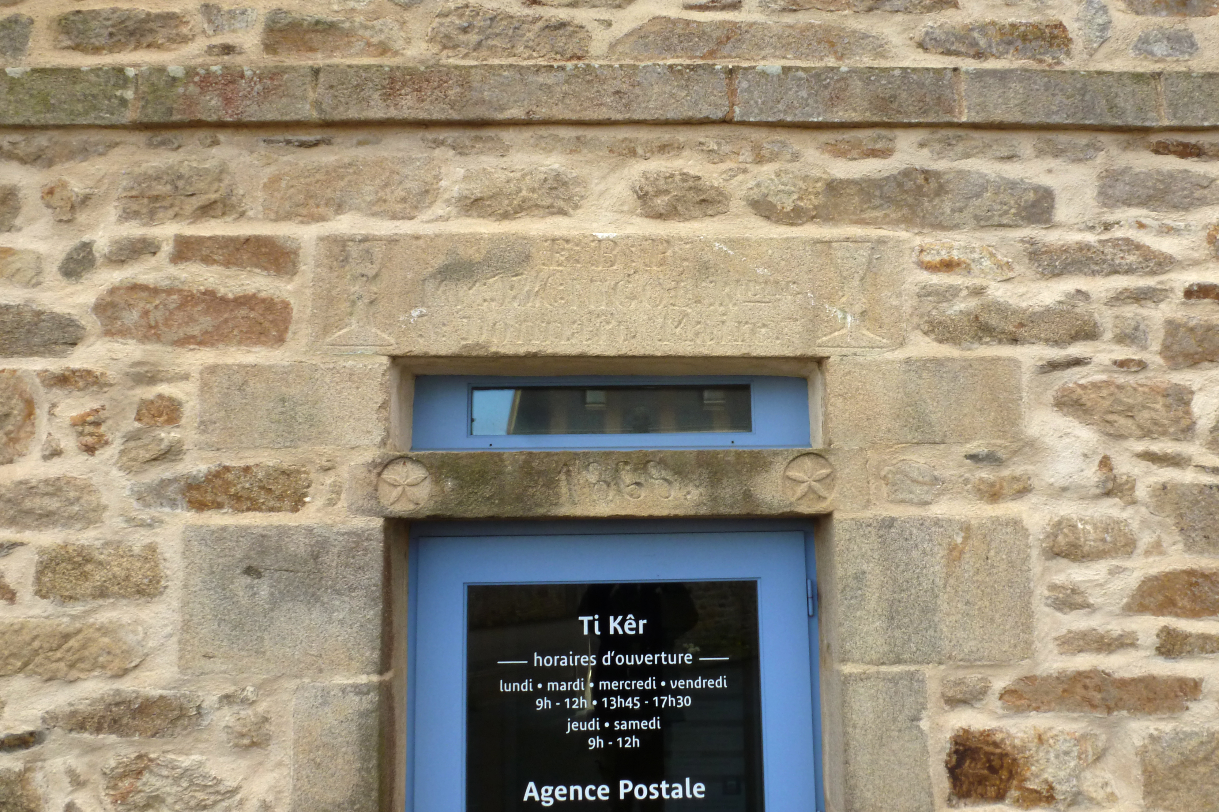 Secteur nord, ancien presbytère daté 1816 et 1868 devenu mairie. Détail de la porte d'entrée nord : date de 1868 et calices.Immatriculation