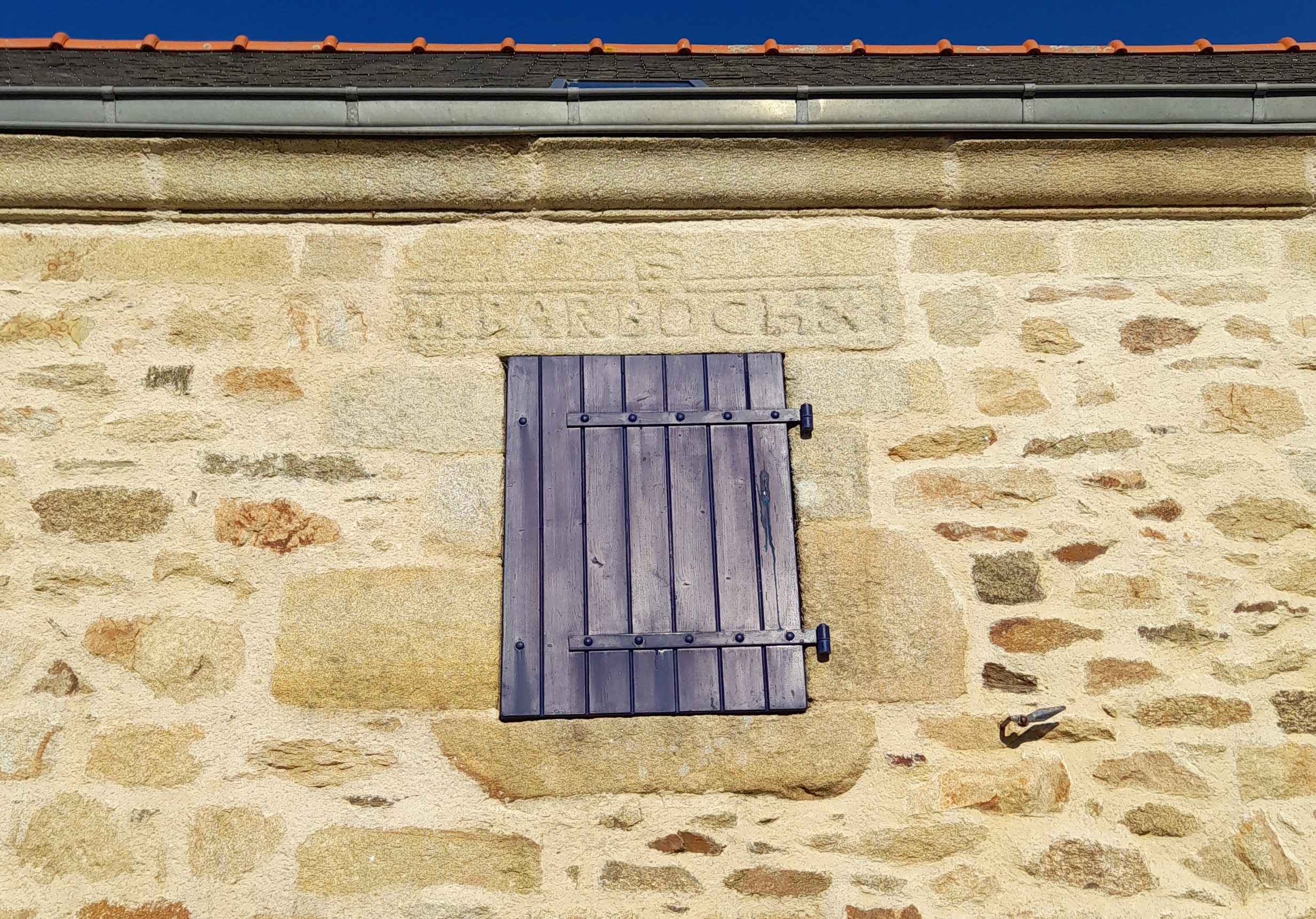 Secteur nord, maison 3. Détail de la fenêtre centrale de l'étage et inscription : F / M : BARBOCH.Immatriculation