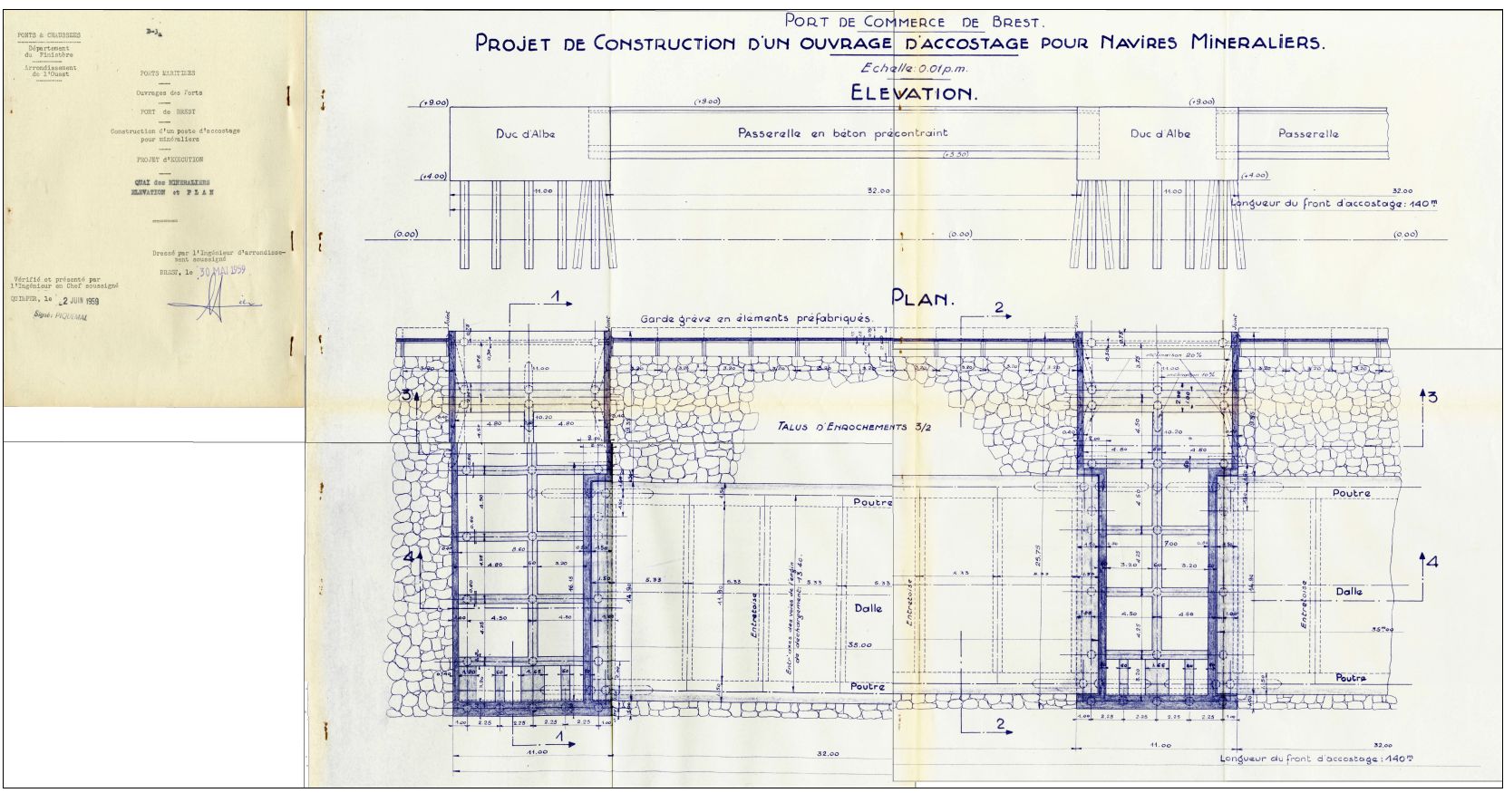 Plan et élévation quai des Minéraliers, dressés par l'ingénieur Piquemal, mai 1959 (Ponts-et-Chaussées, département du Finistère, projet d'un ouvrage d'accostage pour navires minéraliers)Immatriculation