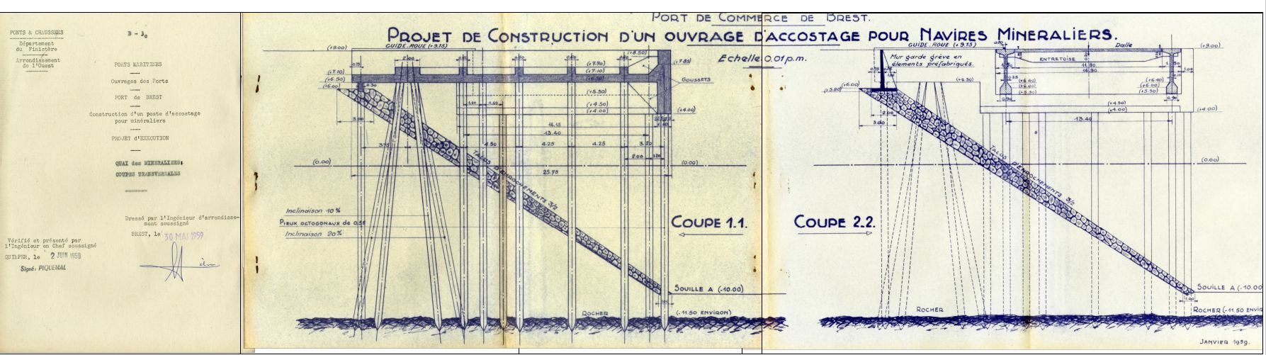 Coupes transversales du quai Minéralier, dressées par l'ingénieur Piquemal, mai 1959 (Ponts-et-Chaussées, département du Finistère, projet d'un ouvrage d'accostage pour navires minéraliers)Immatriculation
