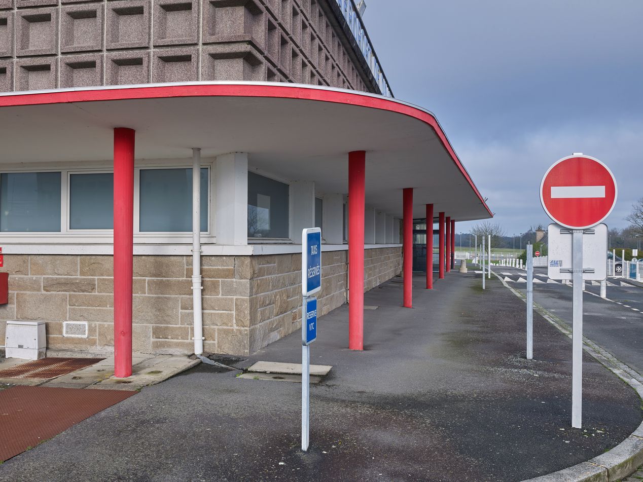 Aérogare, détail de l'auvent en béton, référence à l'architecture de Jean Prouvé (2022)Immatriculation
