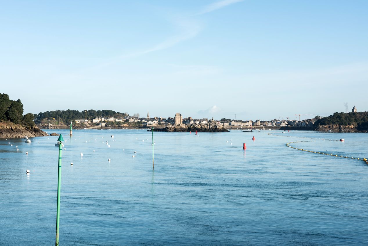 Vue de situation depuis le barrage de la Rance au sud, la tour et le rocher de BizeuxImmatriculation