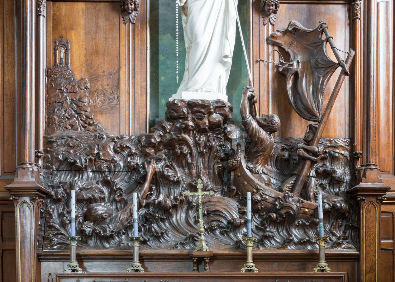 Vue de détail, sculpture de la scène de péril avec un marin implorantImmatriculation