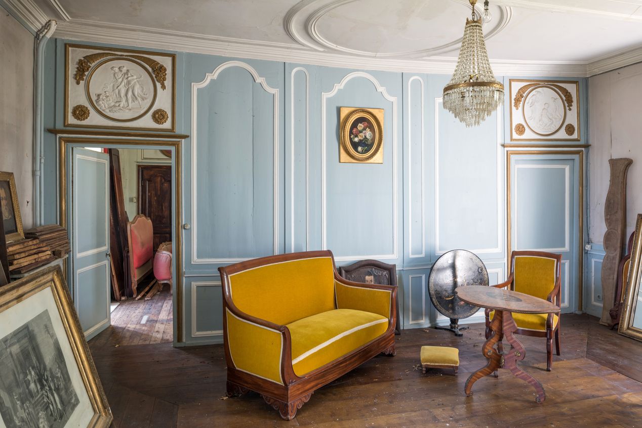 Vue générale du salon orné de panneaux de boiseries et gypseries en imposte des portesImmatriculation