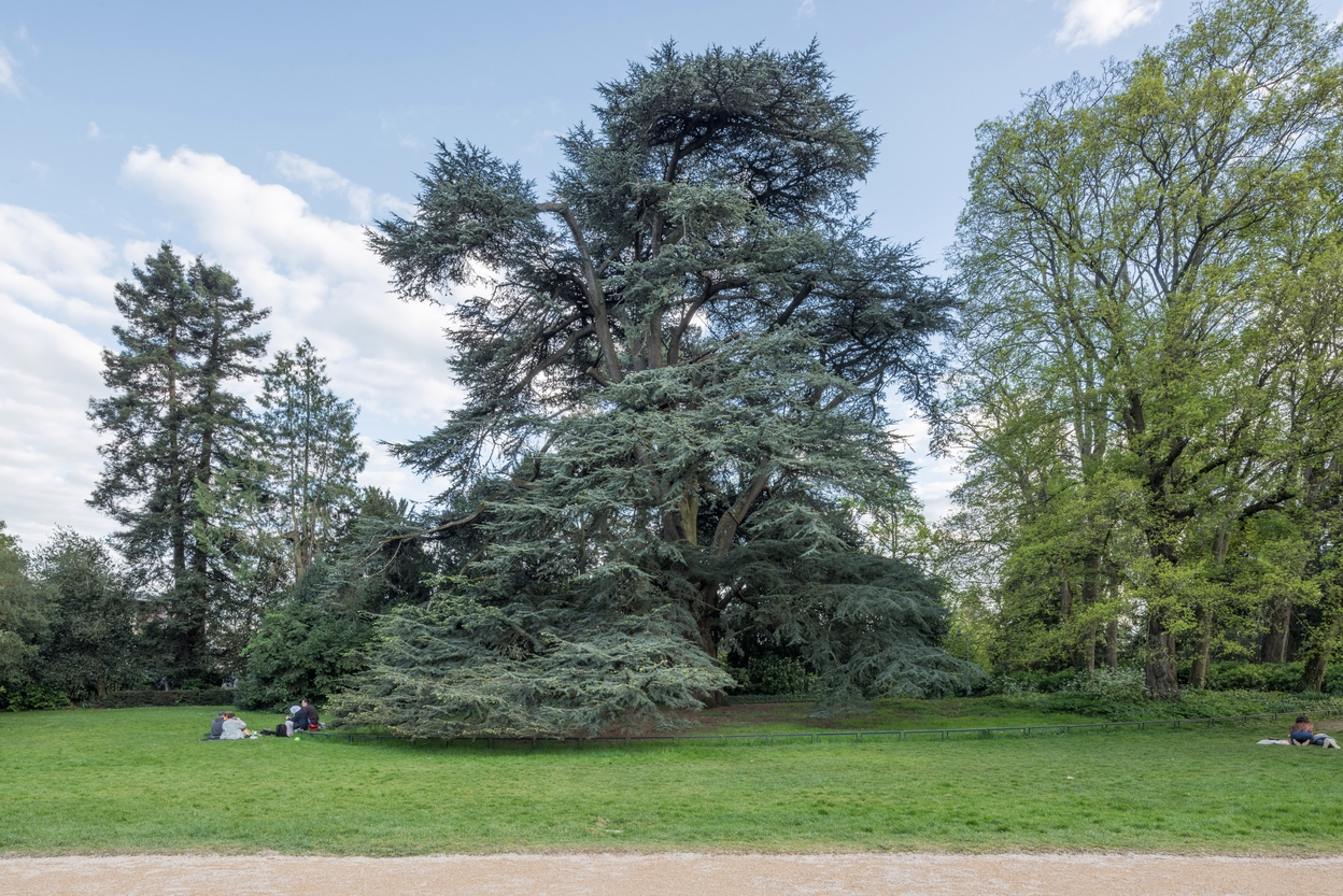 Cèdre du Liban, dont certaines branches bénéficient de poteaux de soutènement.Immatriculation