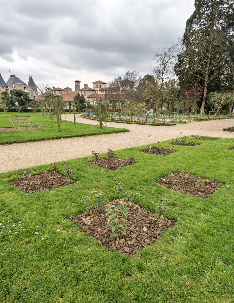 Roseraie, aménagement de 11 plates-bandes concentriques de 1,50 mètres de large. Vue nord-ouest sud-est. Au fond, le lycée Saint-Vincent.Immatriculation