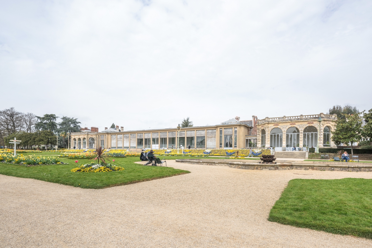 Bâties en pierre meulière, les orangeries sont percées d'arcades sur toutes les façades exposées au soleil, et séparées par des serres. Vue sud-est nord-ouest.Immatriculation