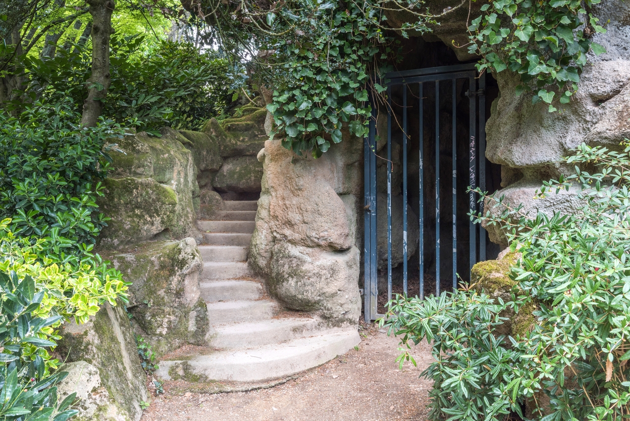 Détail de l'entrée de la construction en béton, imitant la roche, désormais recouverte de lierre et dont l'accès est grillagé. A gauche, un escalier de même nature conduit à l'esplanade plus large du jardin.Immatriculation