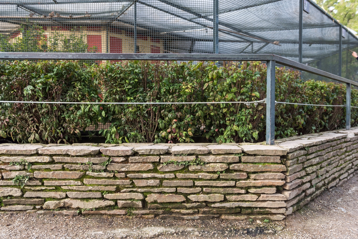 Jardinières aménagées, plantées d'arbustes, afin de maintenir les visiteurs à distance des cages.Immatriculation
