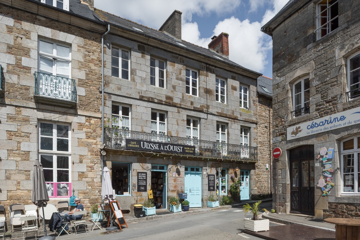 Café librairie ‘Ulysse à l’ouest’, rue de la Chanvrerie : la coloration de l’immeuble, en granit bleu de Lanhelin, est relativement distinctive au milieu des édifices voisins.Immatriculation