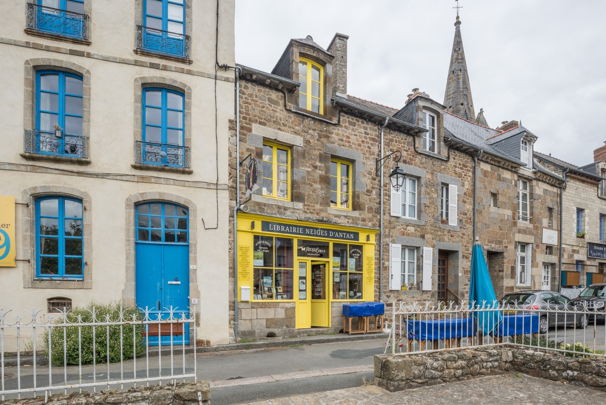 Librairie ‘Neiges d’antan’, rue de la Chanvrerie : le caractère de l'architecture de Bécherel s'exprime dans les couleurs complémentaires de huisseries et des appliques de commerce.Immatriculation