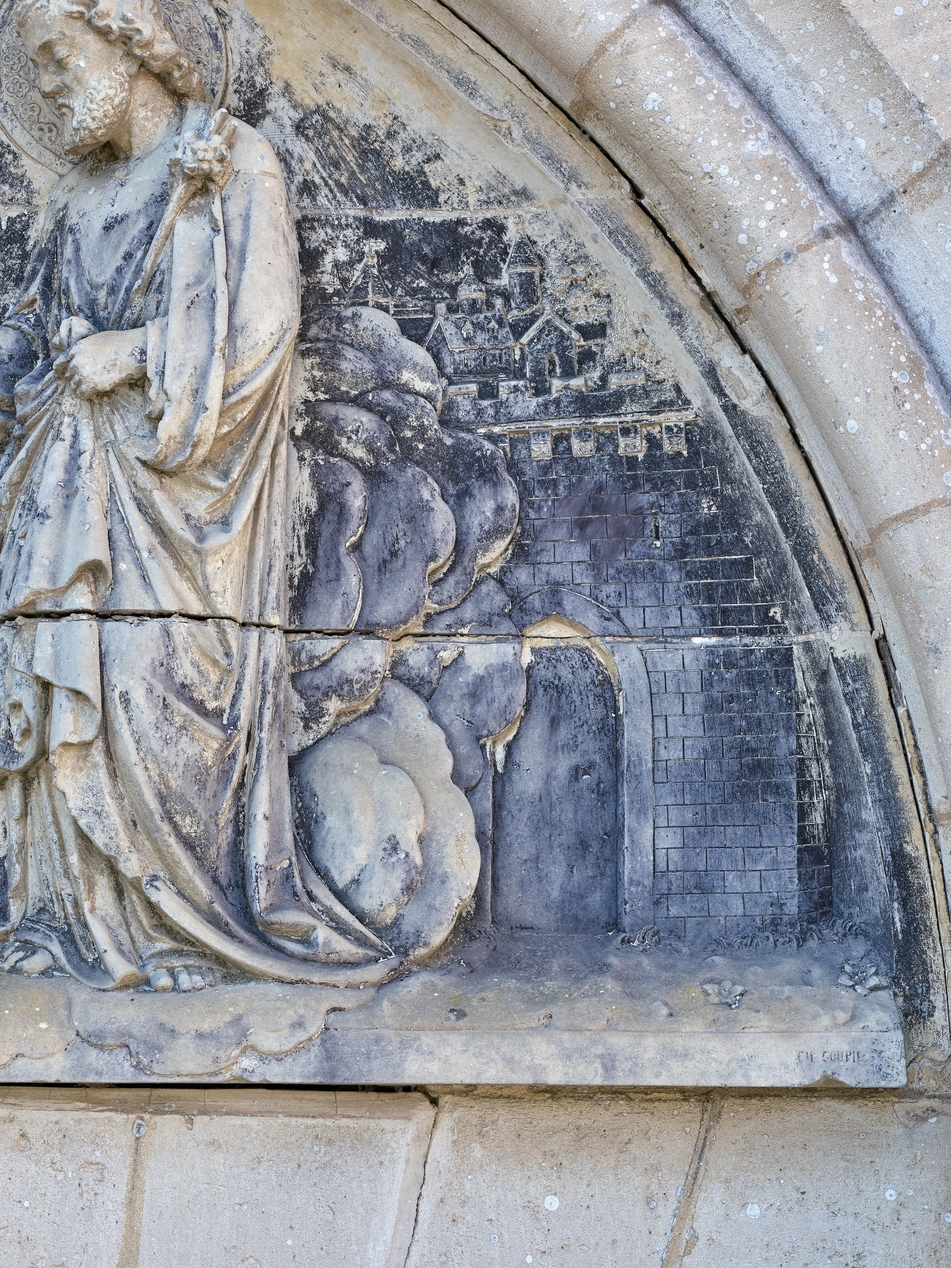 Partie droite du tympan avec la signature du sculpteur rennais Charles Goupil. Représentation d'une ville fortifiée (Sedan, Metz ?) prise pendant la guerre de 1870-1871Immatriculation