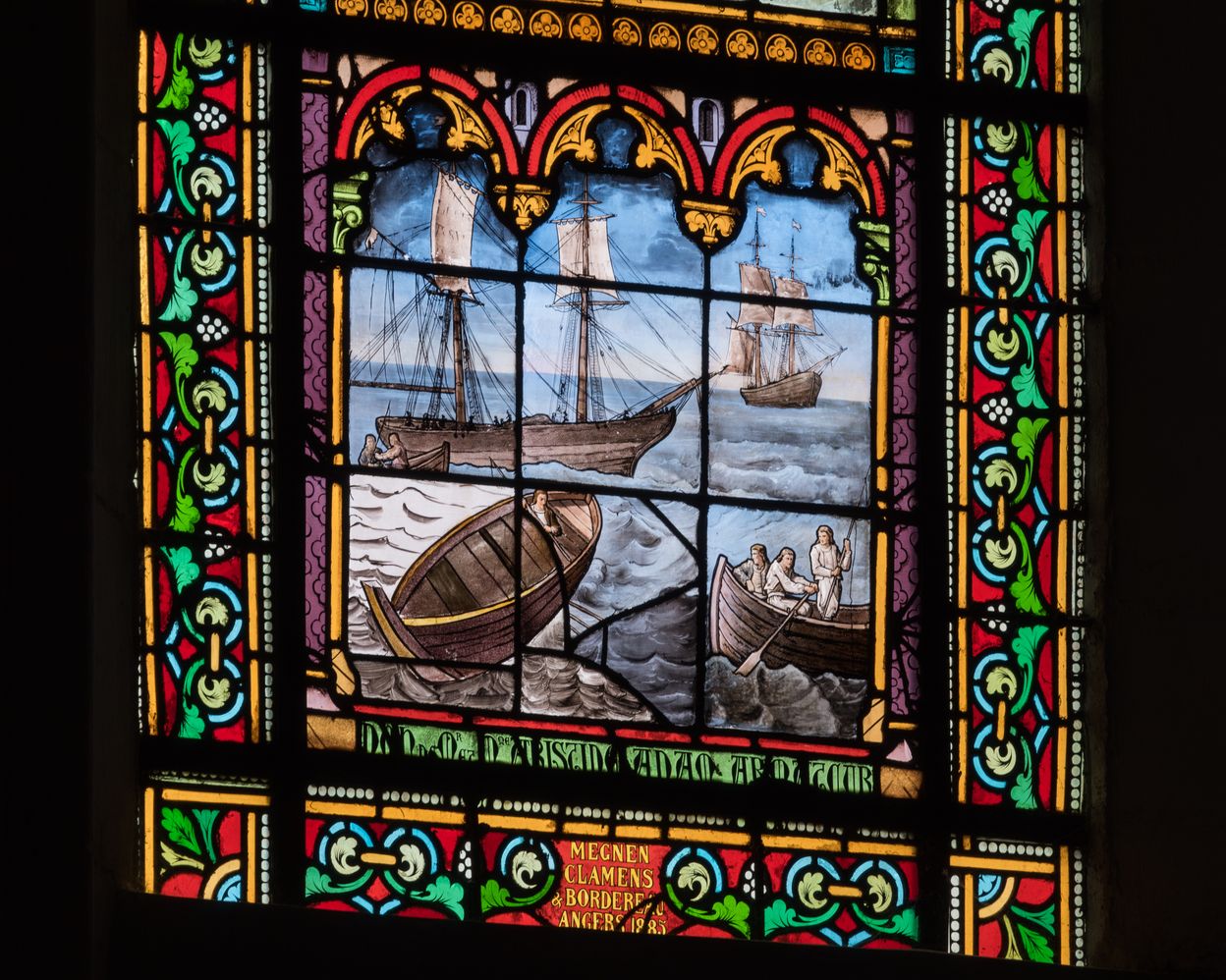 Verrière ex-voto de la baie 4 : Marins naufragés implorant la Vierge, église paroissiale Saint-Méen (Cancale),