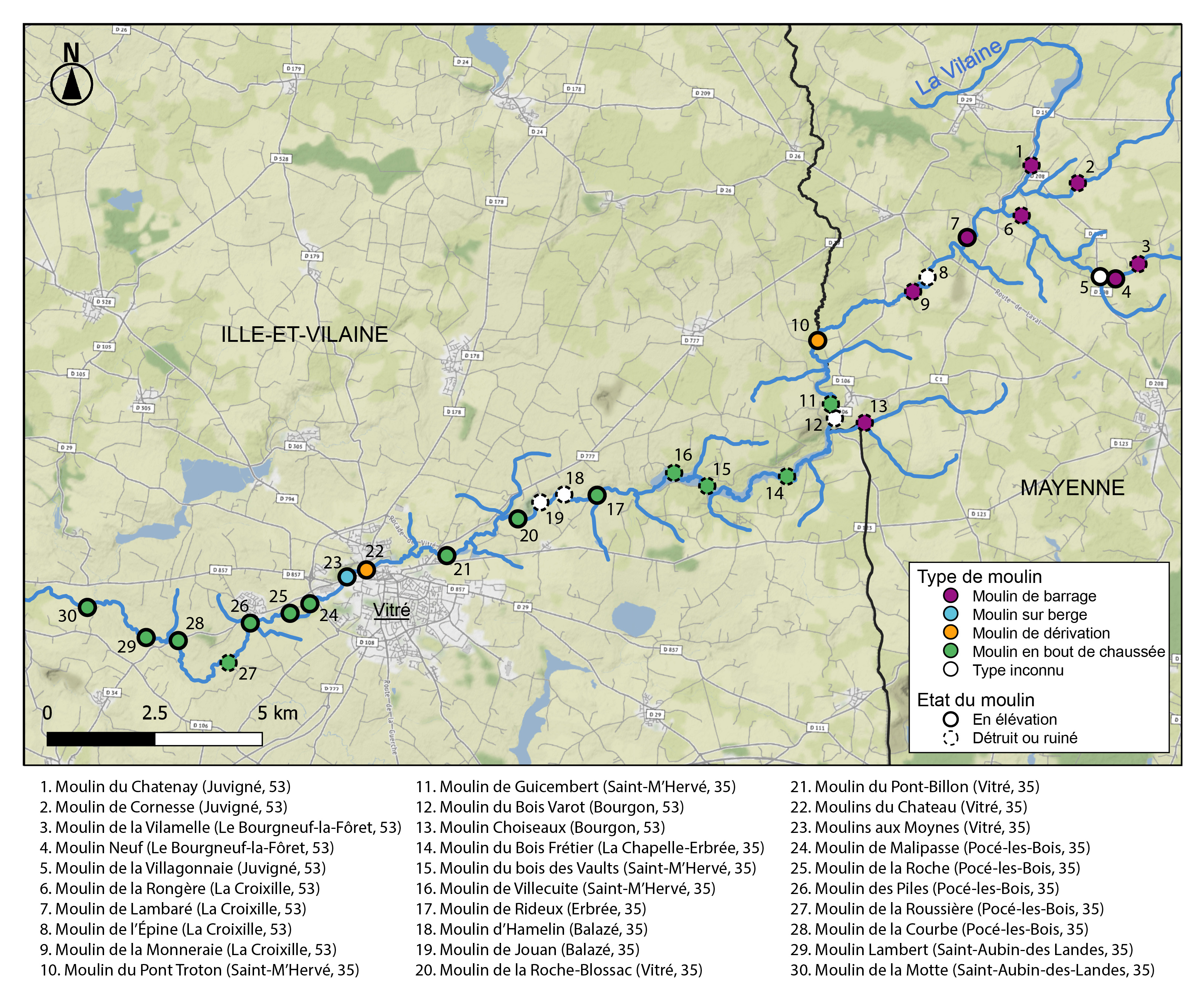Les moulins du cours d'eau La Vilaine (partie amont),