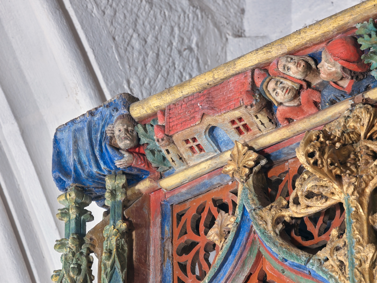 Détail : homme caché derrière un rideau se dévoilant, château fort, deux femmes et un seigneurImmatriculation