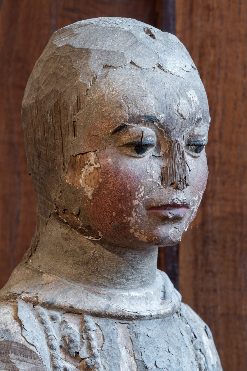 Détail du visage de la statue-reliquaire de saint Etienne : le nez de saint Etienne est manquant.Immatriculation
