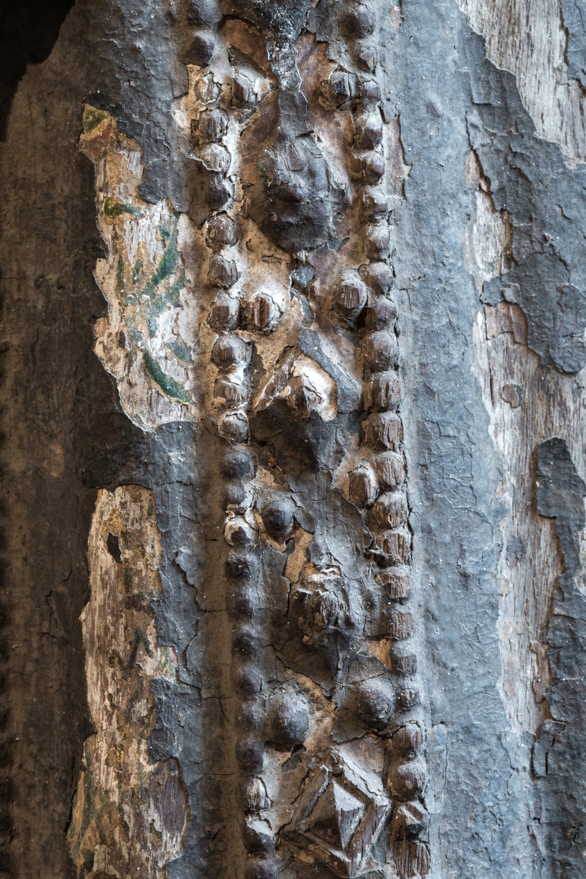 Détail de la statue-reliquaire de saint Etienne : une ancienne polychromie est visible sous la peinture écailléeImmatriculation