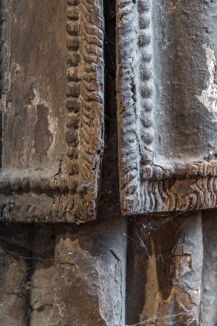 Détail de la statue-reliquaire de saint Etienne : les fentes latérales sont bordées de franges et d'orfroisImmatriculation