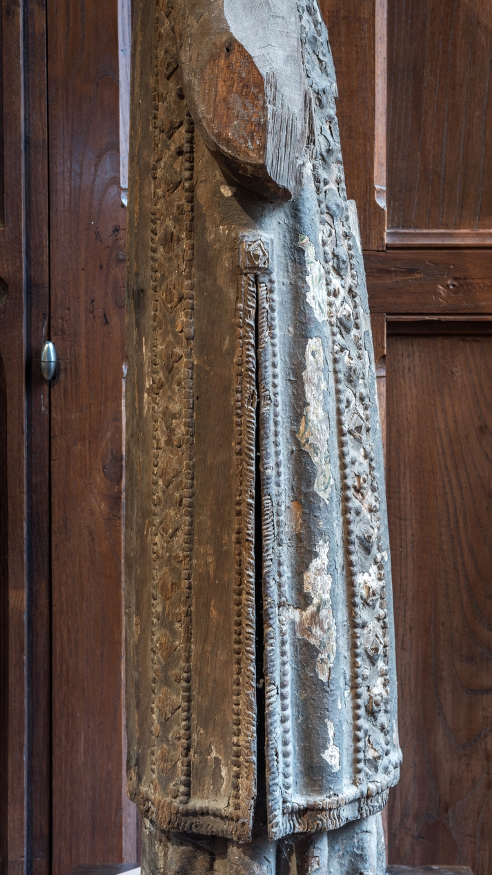 Vue de profil de la statue-reliquaire de saint Etienne : la fente latérale caractérise la dalmatiqueImmatriculation