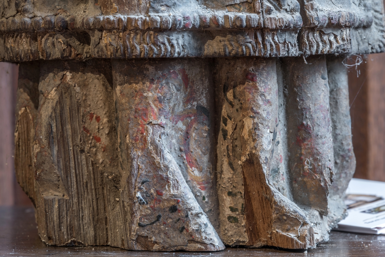 Détail de la partir basse de la statue-reliquaire de saint Etienne : une polychromie ancienne à dominante rouge est visible sur le vêtement du dessousImmatriculation