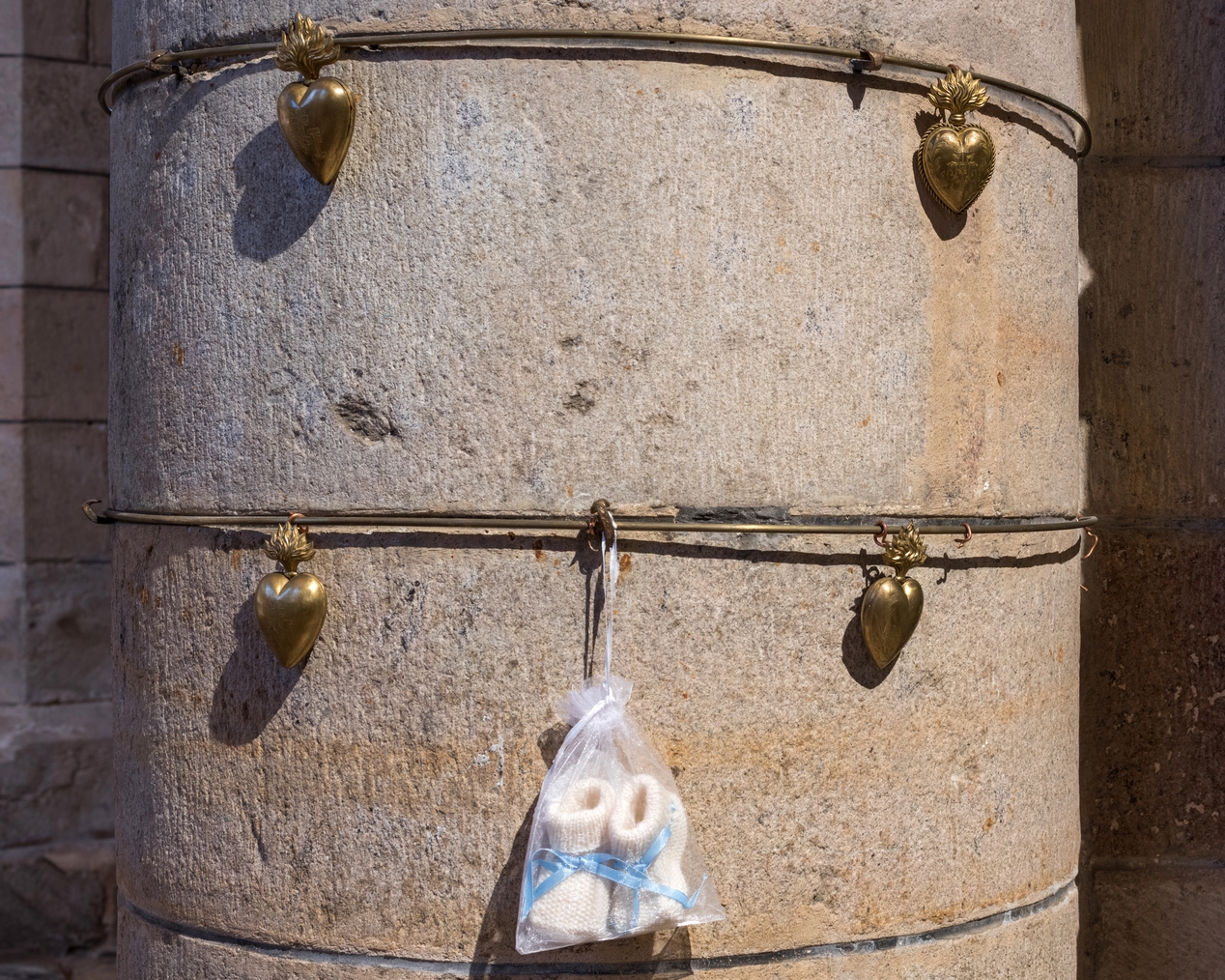 Ex-votos attachés au pilier séparant la chapelle de pèlerinage du sanctuaire.Immatriculation