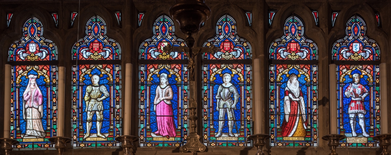 Des membres de la famille de Rohan ayant financé la réalisation de cette verrière au XIXe s. ont dû servir de modèle pour ces personnages ayant vécu à la fin du Moyen Âge.Immatriculation