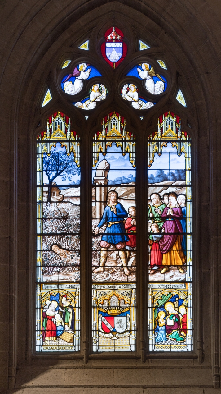 Verrière à personnages de la baie 3 : Découverte de la statue de Notre-Dame du Roncier au IXe siècle, basilique Notre-Dame-du-Roncier (Josselin),