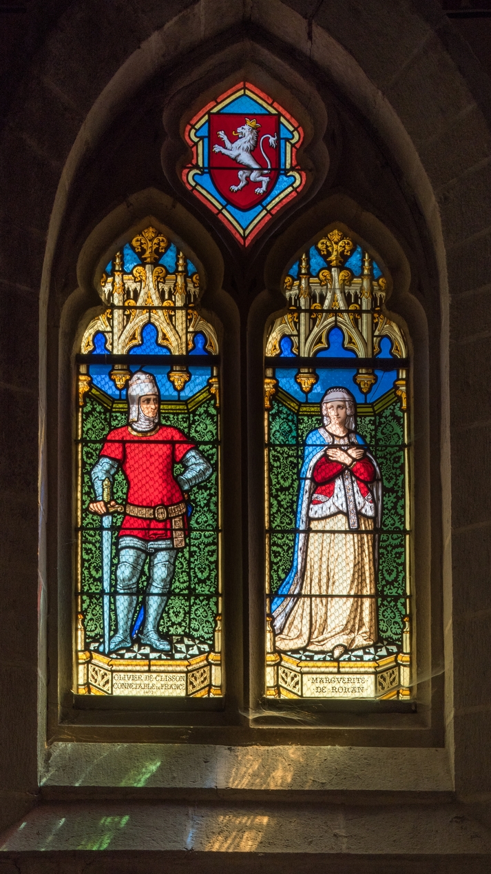Verrières de la baie 2 : Scènes de la vie de sainte Marguerite d'Antioche et de la baie 4 : Olivier de Clisson et Marguerite de Rohan, basilique Notre-Dame-du-Roncier (Josselin),