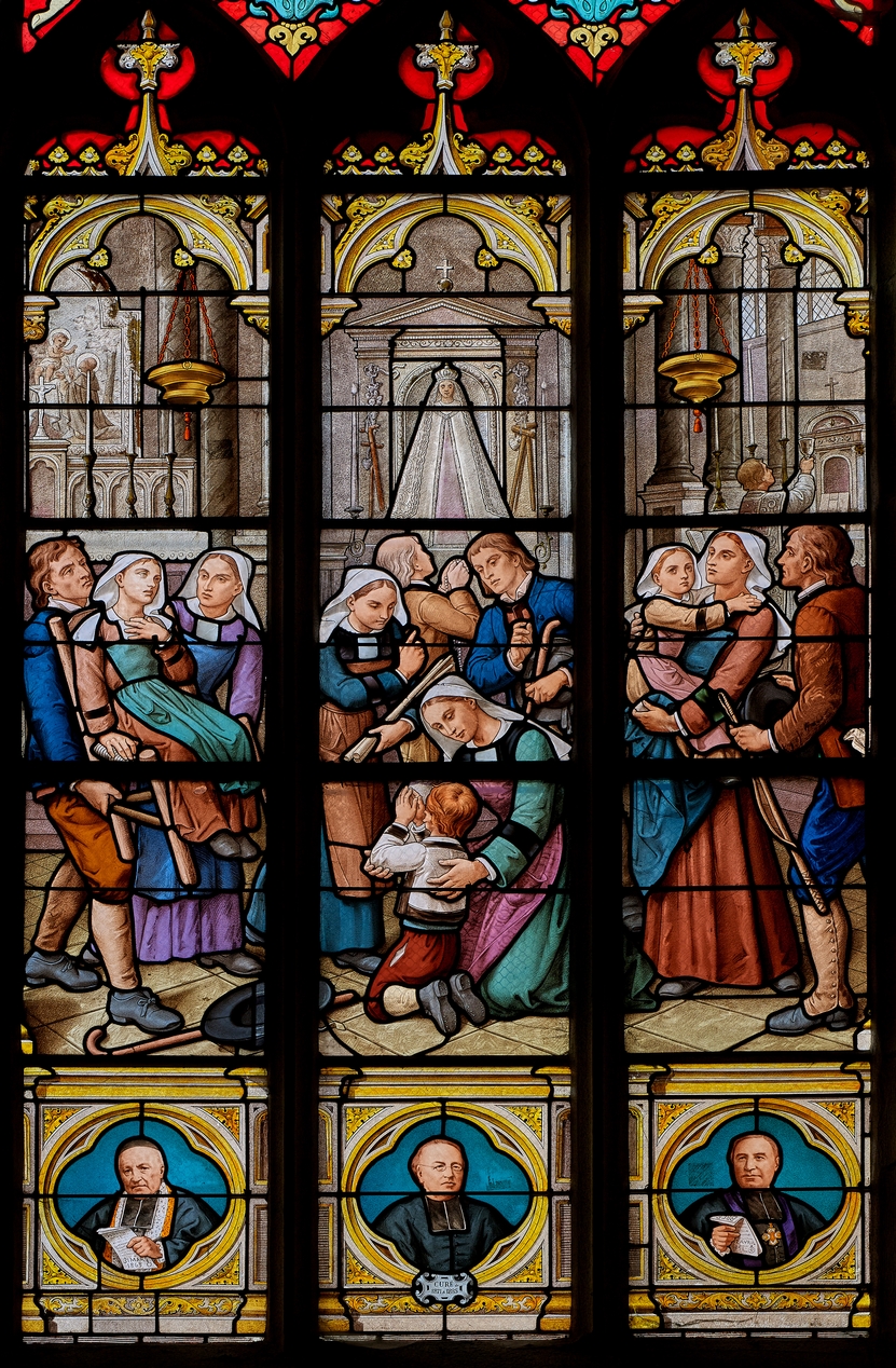 Verrière à personnages de la baie 11 : Guérison des enfants de Camors, basilique Notre-Dame-du-Roncier (Josselin),