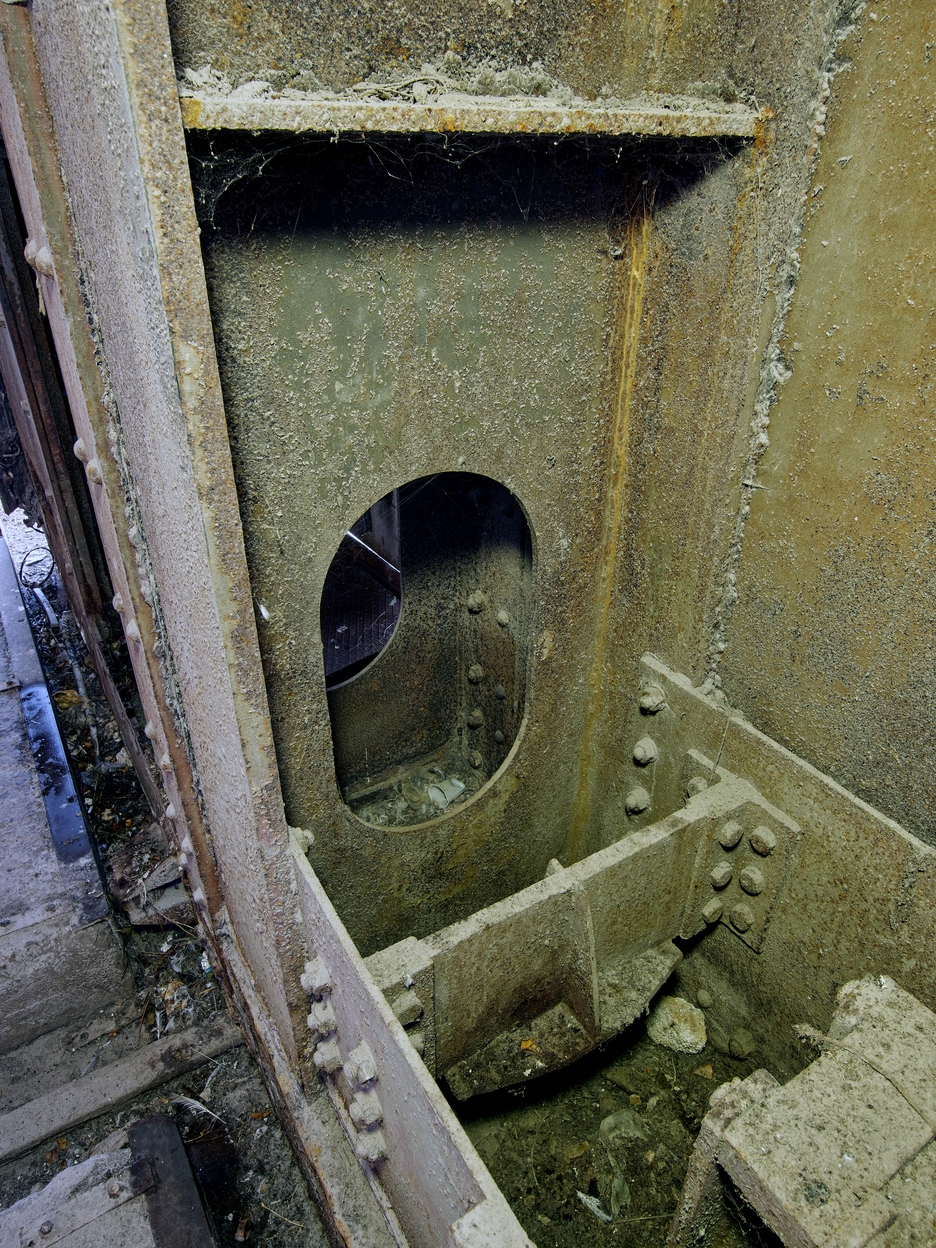 Vue intérieure de l'un des deux volets de la porte blindée nord. La porte est assemblée comme une double coque de bateauImmatriculation