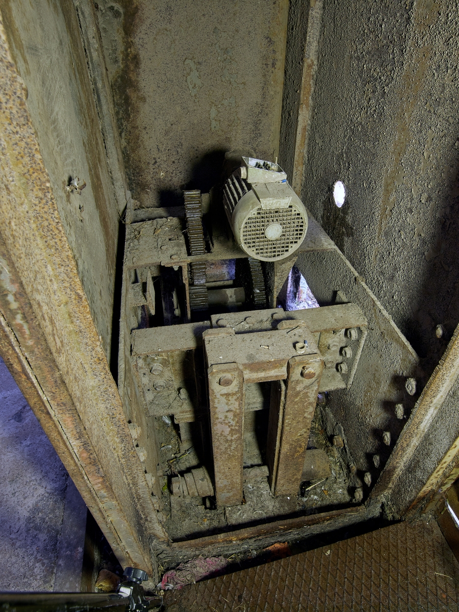 Vue intérieure de l'un des deux volets de la porte blindée nord : système motorisé permettant le blocage de la porteImmatriculation