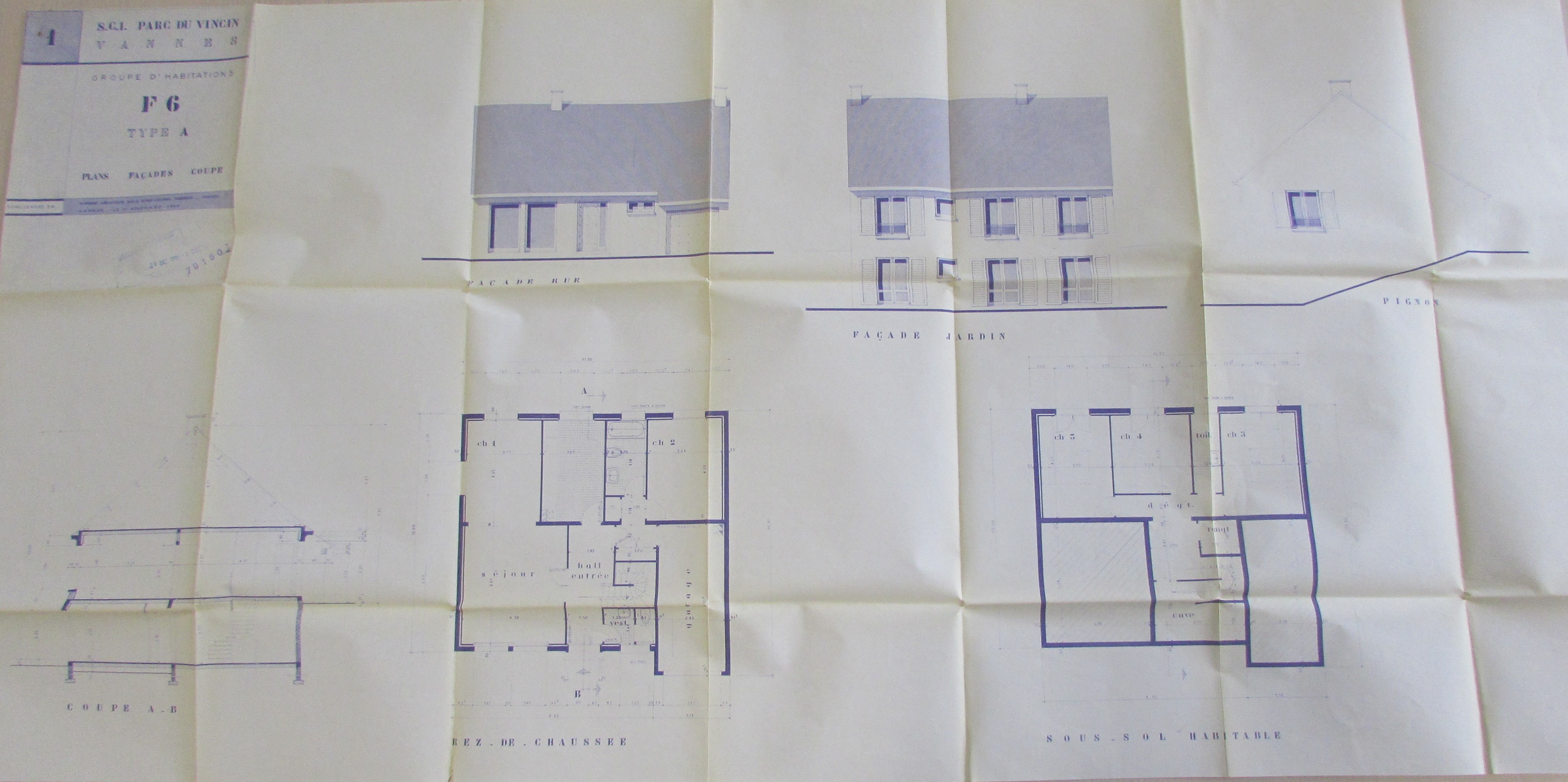 Plans, façades, coupe, maison F6 type A, 1968 par M. Morin. AM Vannes 35 W 3867.Immatriculation
