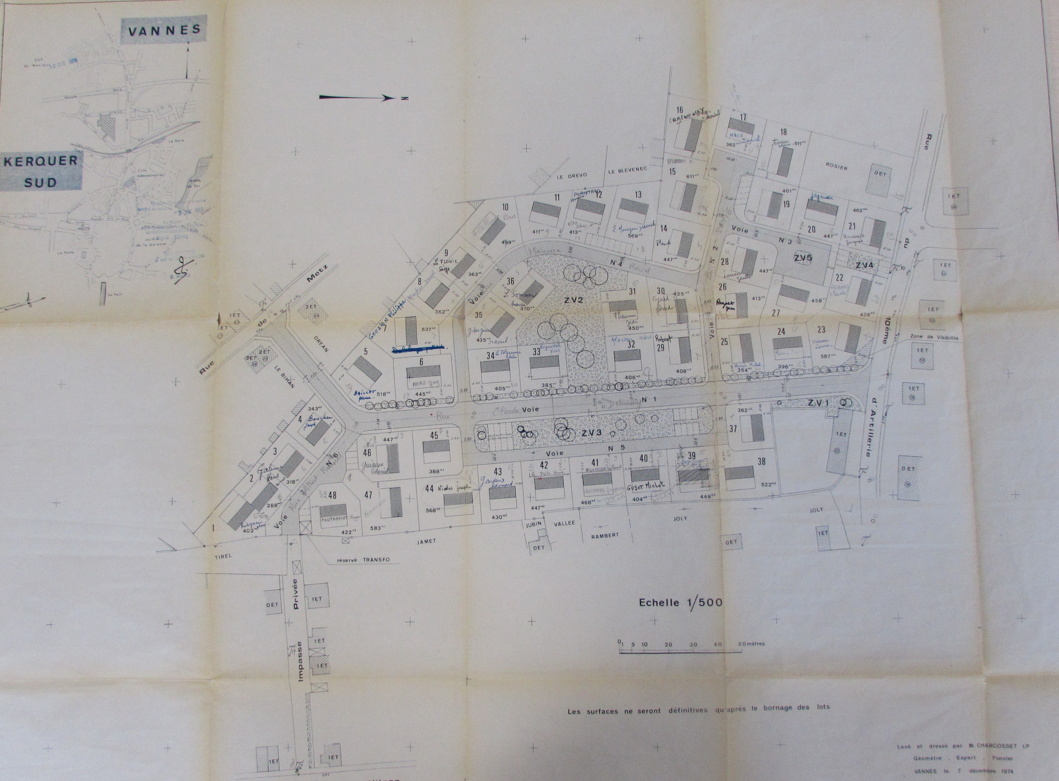 Plan du lotissement de Kerquer Sud par Charcosset, 1974. AM Vannes 70W224.Immatriculation