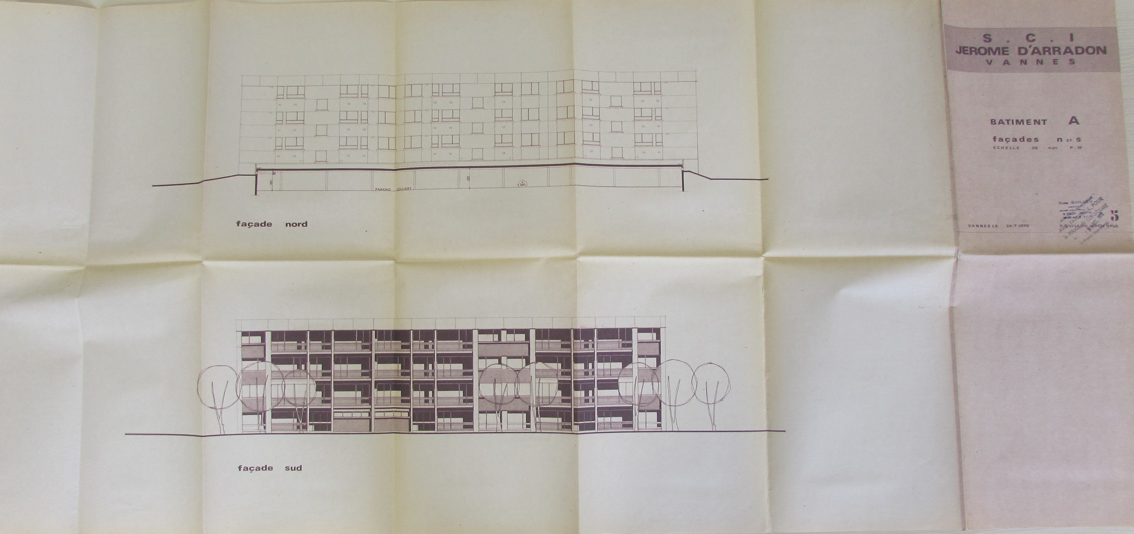 Bâtiment A façades nord et sud, 1970 par Yves Guillou. AM Vannes 35 W 4201.Immatriculation