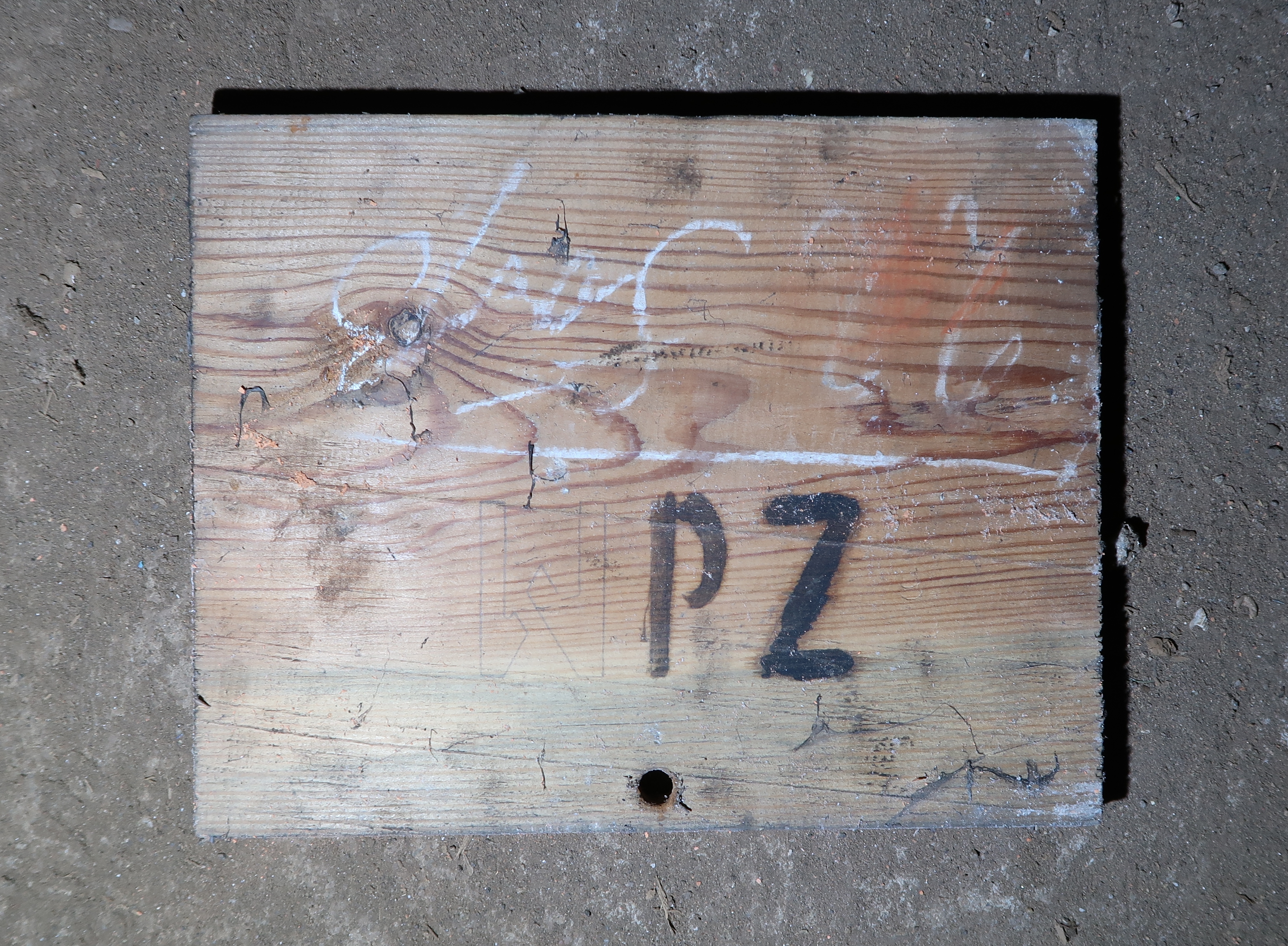 Rez-de-chaussée : panneau en bois avec marquage "PZ" [revers] et inscription à la craie (box 12)Immatriculation