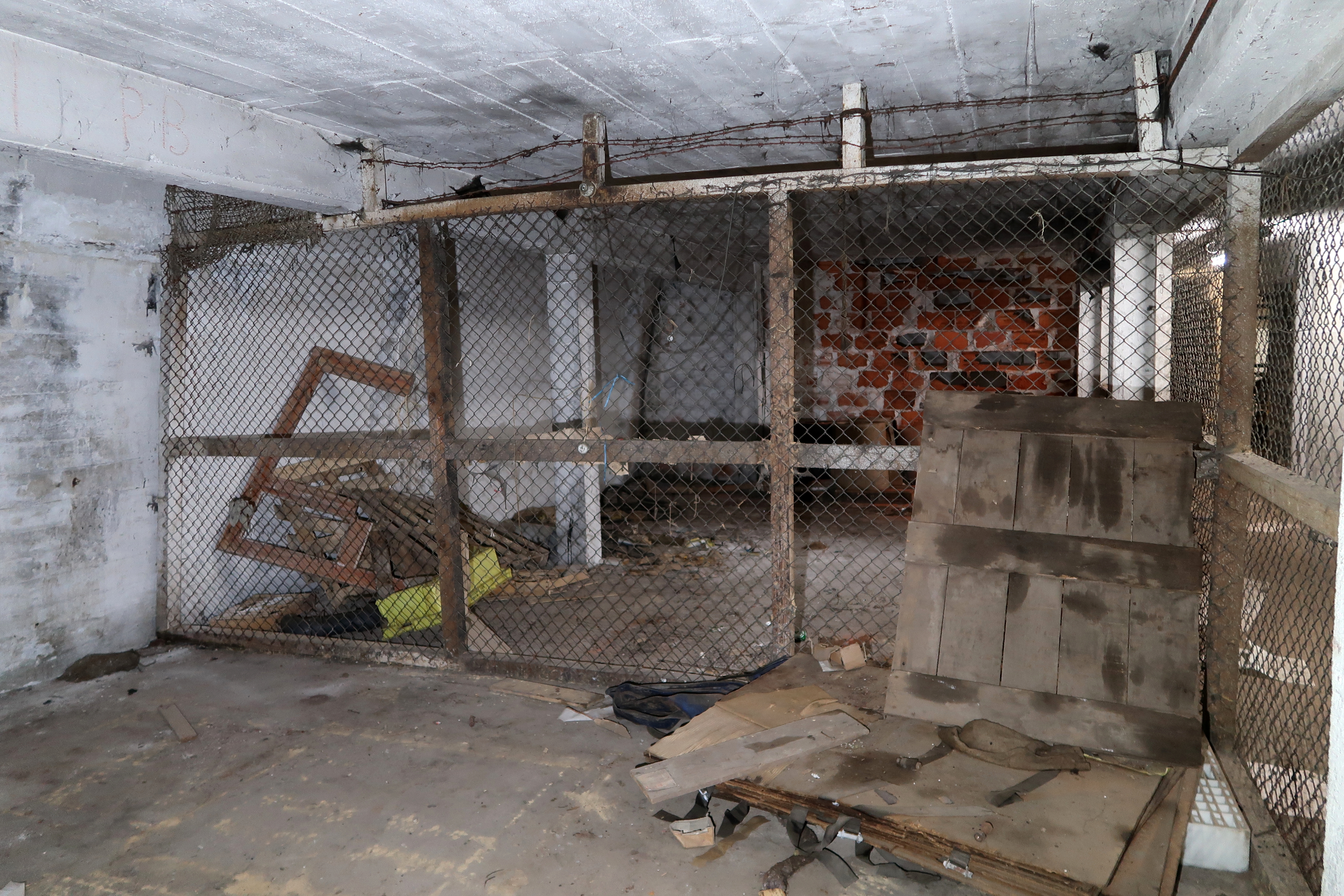 Premier étage : grillage surmonté de deux rangs de fil barbelé séparant deux boxes (box 21). A gauche sur la poutre, marquage "I PB"Immatriculation