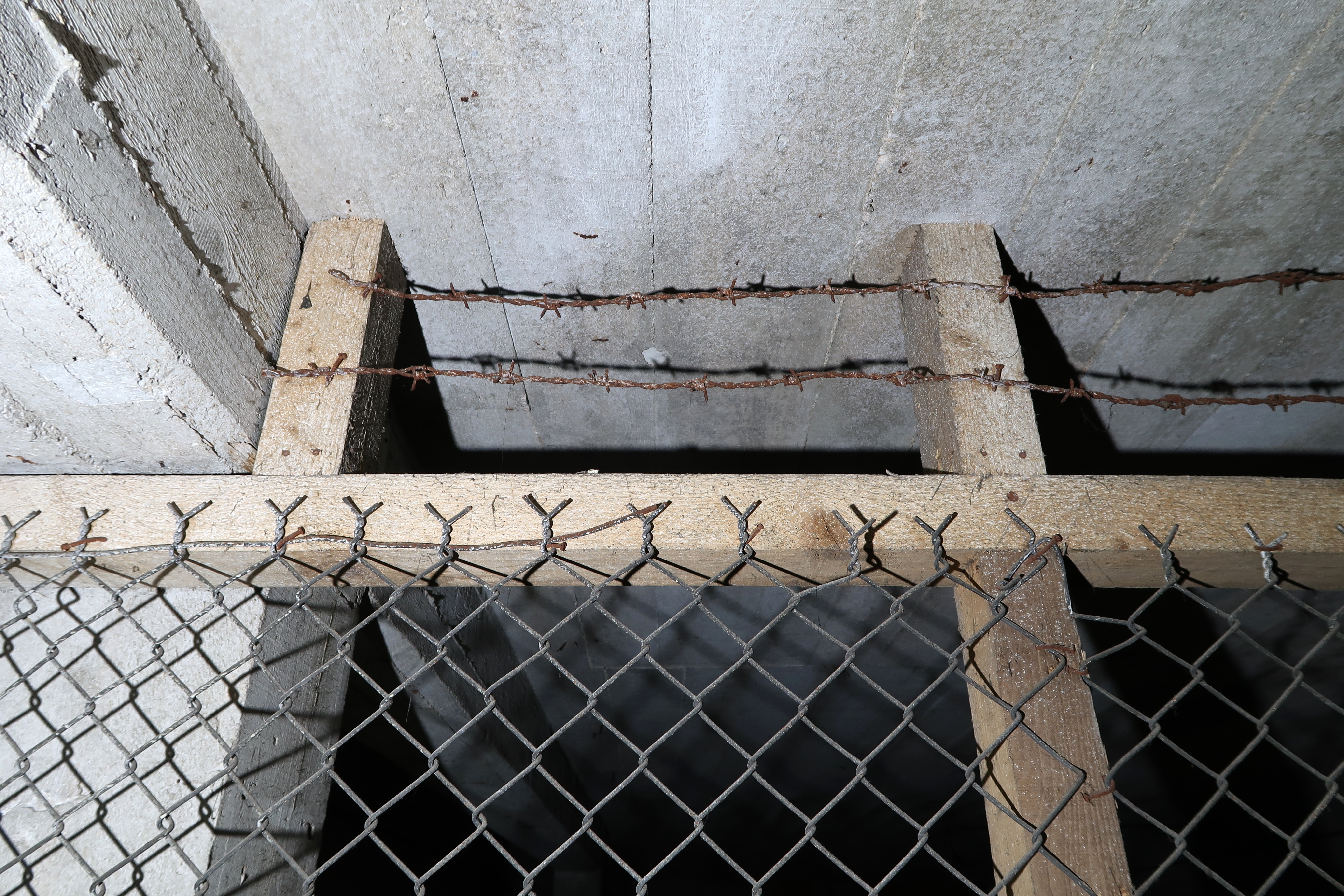 Deuxième étage : rangs de fil barbelé surmontant le grillage séparant deux boxesImmatriculation