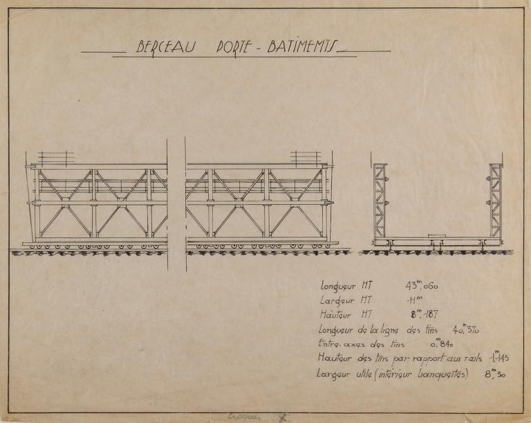 Elévations et coupe du "berceau porte-bâtiments" du bunker "KI", croquis X (Service Historique de la Défense de Lorient, Monographie de la base "Ingénieur Général Stosskopf", 1945-1946)Immatriculation
