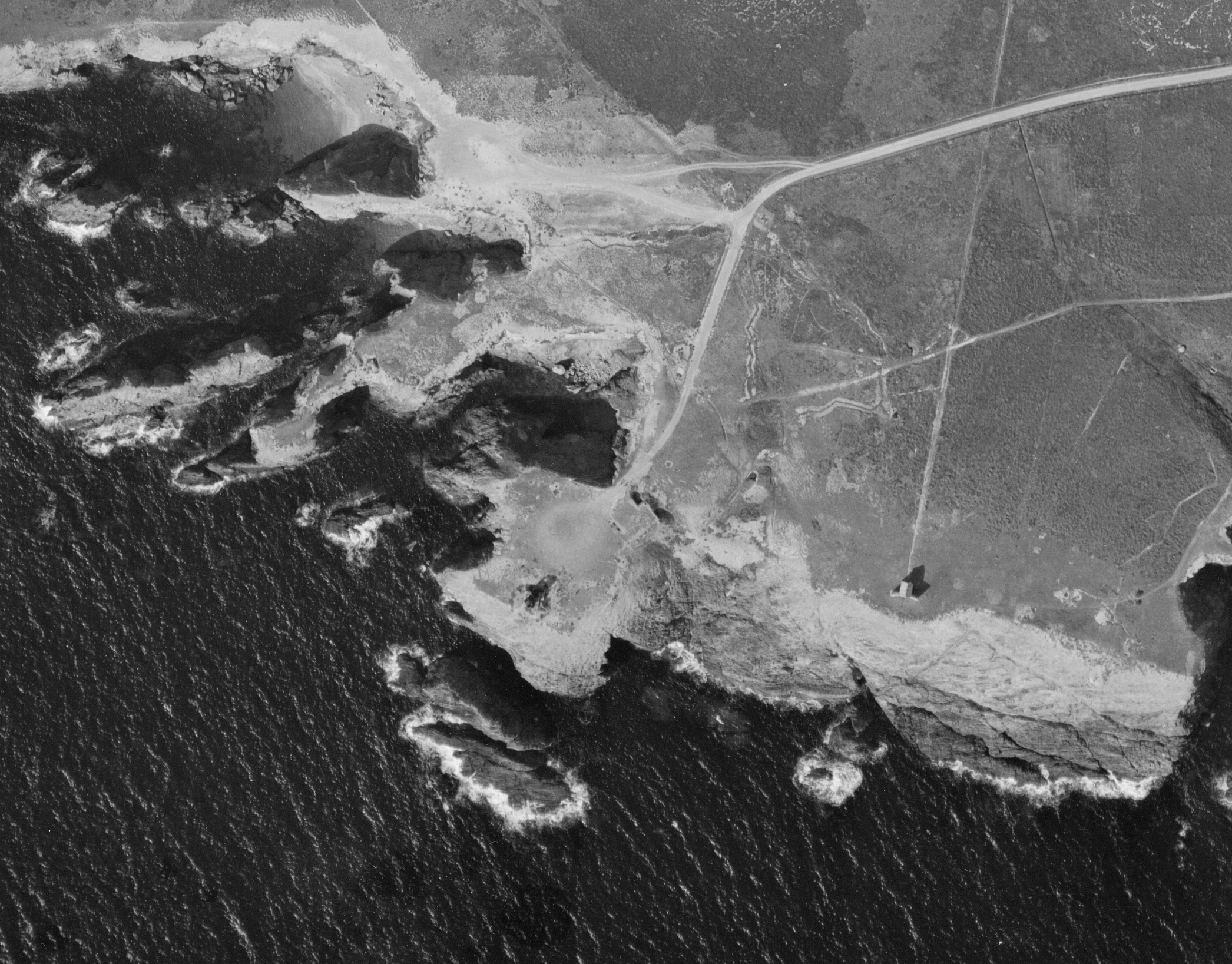 Vue aérienne verticale, 1950 (La photographie n'est pas tout à fait orientée vers le nord). La station radar est parcourue de nombreuses tranchées (reliant les Tobruk) et le radar Würzburg est encore en placeImmatriculation