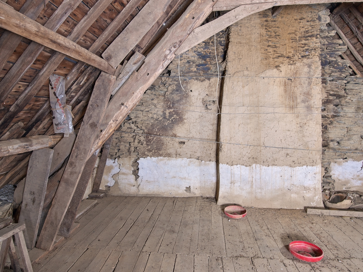 Comble. Partie sud-est. Détail du conduit de cheminée et d'un arbalétrier contreventé par des jambettesImmatriculation