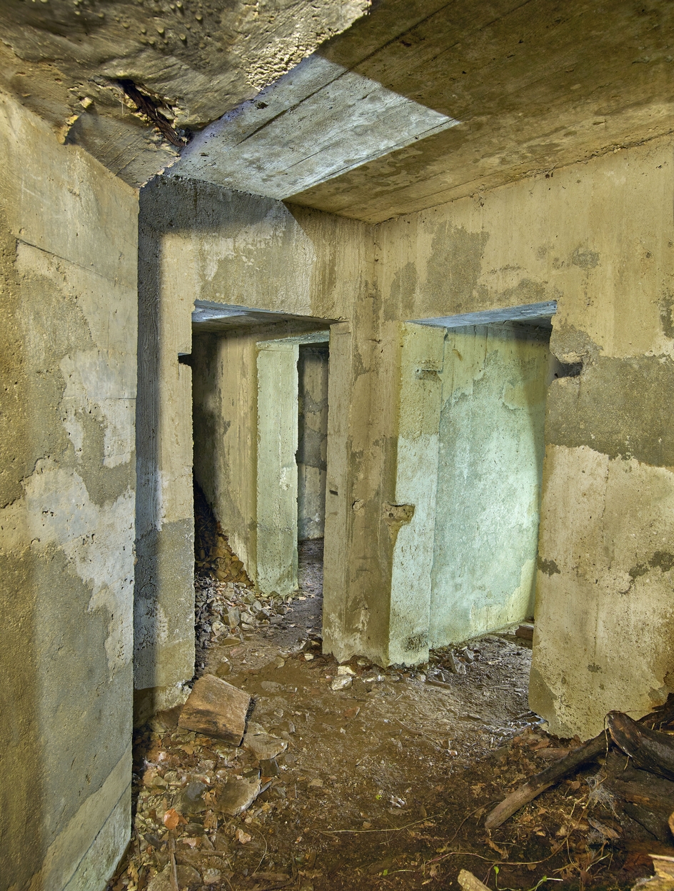 Vue du vestibule distribuant les deux postes d'observation et de tir et une ouverture donnant vers l'extérieur (?). Dans cet espace se trouve un puits débouchant sur la dalle de couverture de la casemate (les échelons ont disparu)Immatriculation